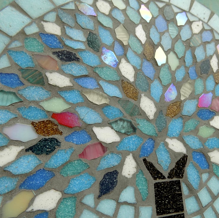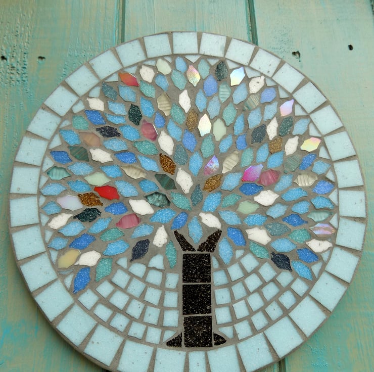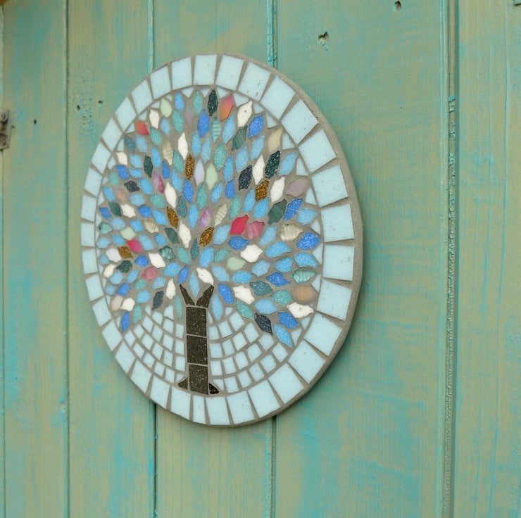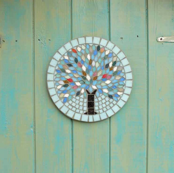 A 25cm (9.75 inch) diameter mosaic plaque made on a slate base with glass tiles and a grey grout designed to repel algae and mould. Finished with a securely attached D-ring for hanging.