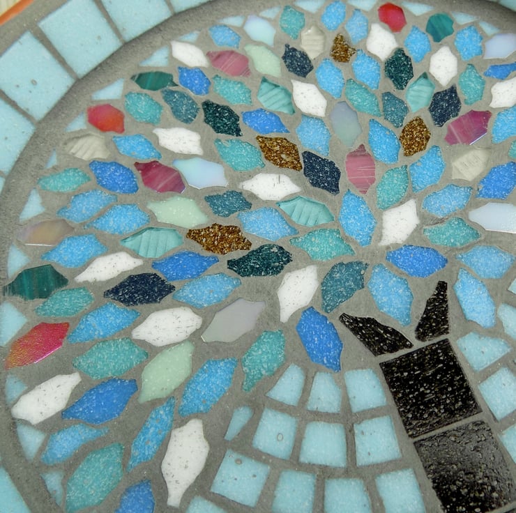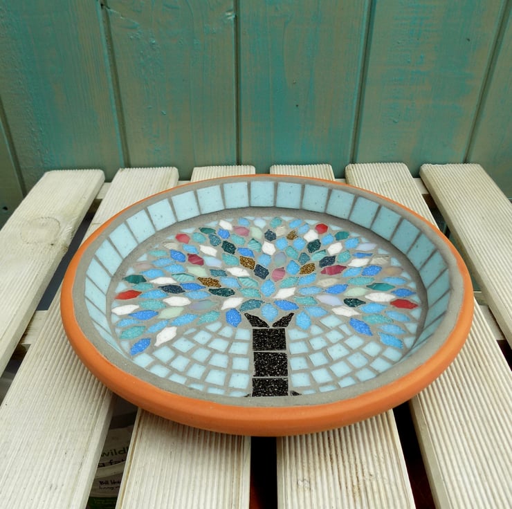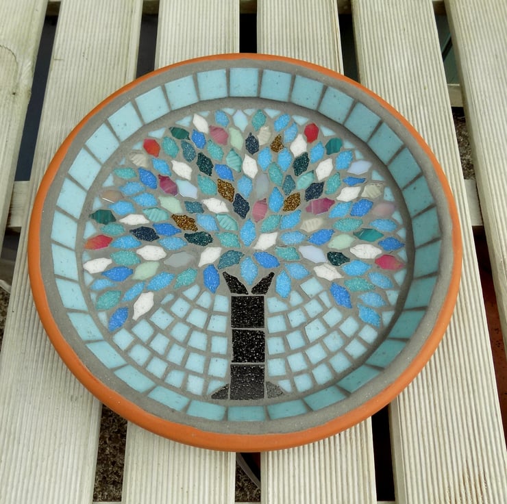 A 25cm (9.75 inch) diameter terracotta saucer with a mosaic made with glass tiles and a grey grout designed to repel algae and mould.