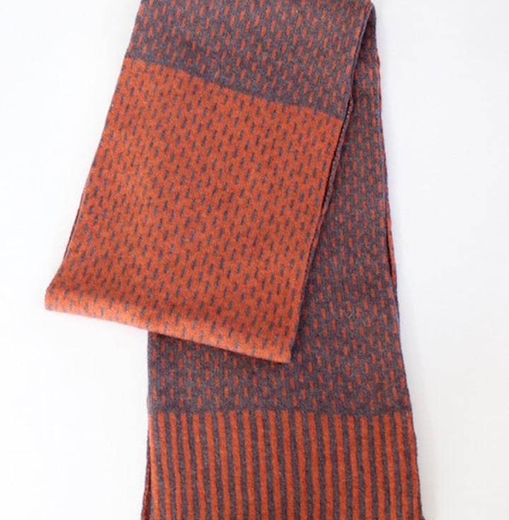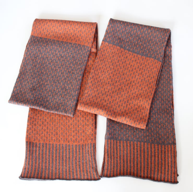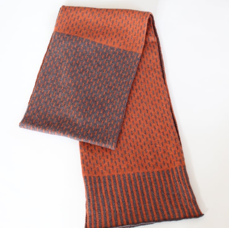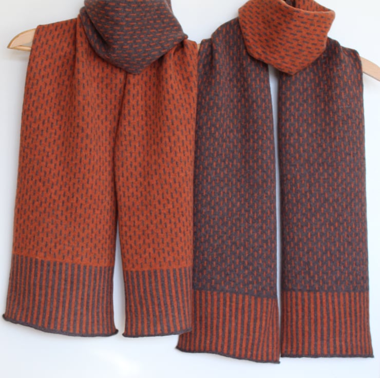 This knitted soft British spun merino lambswool two tone scarf is just enough to keep out the chills and is beautifully soft and cosy. Can be worn draped round the neck or tied into a loose knot.