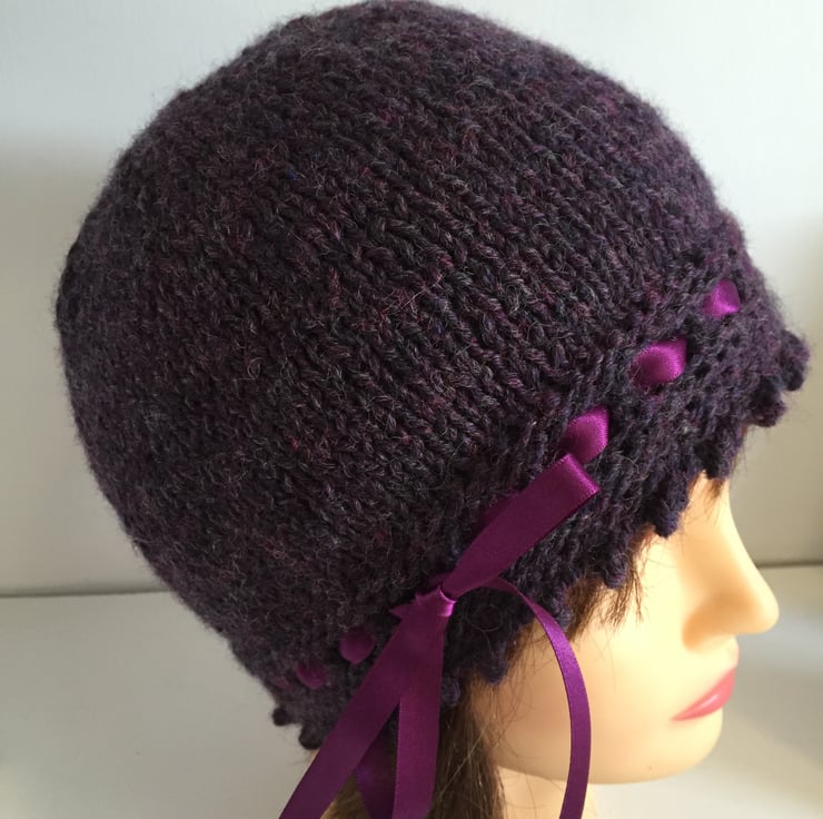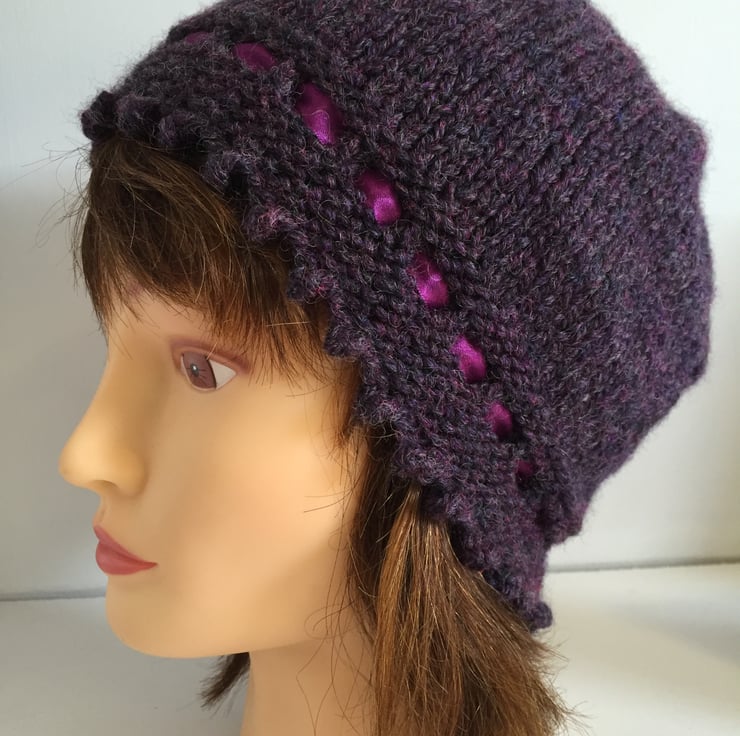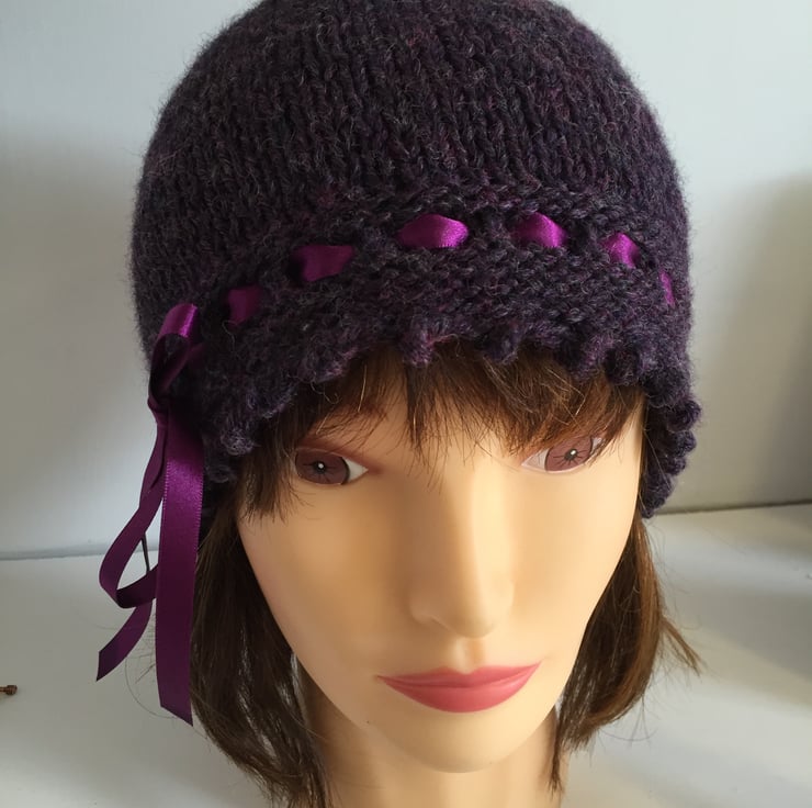 This vintage styled Beanie Hat has been hand knitted in a beautiful subtle purple blend yarn, a colour which suits women of all ages.