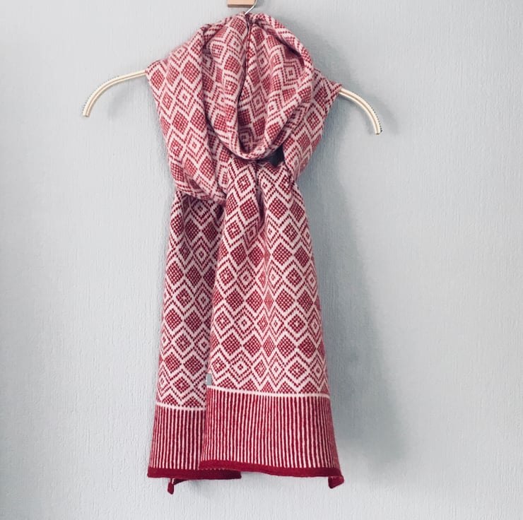 This knitted British spun soft merino lambswool Scandi scarf is just enough to keep out the chills and is beautifully soft and cosy. Can be worn draped round the neck or tied into a loose knot. The Scarf pattern is simplified traditional Scandinavian pattern and colours.