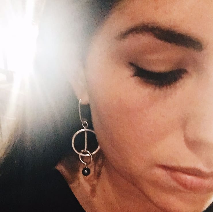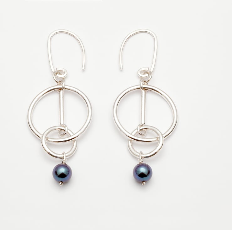 A pair of statement sterling silver and black pearl earrings made up of interlocking rings.