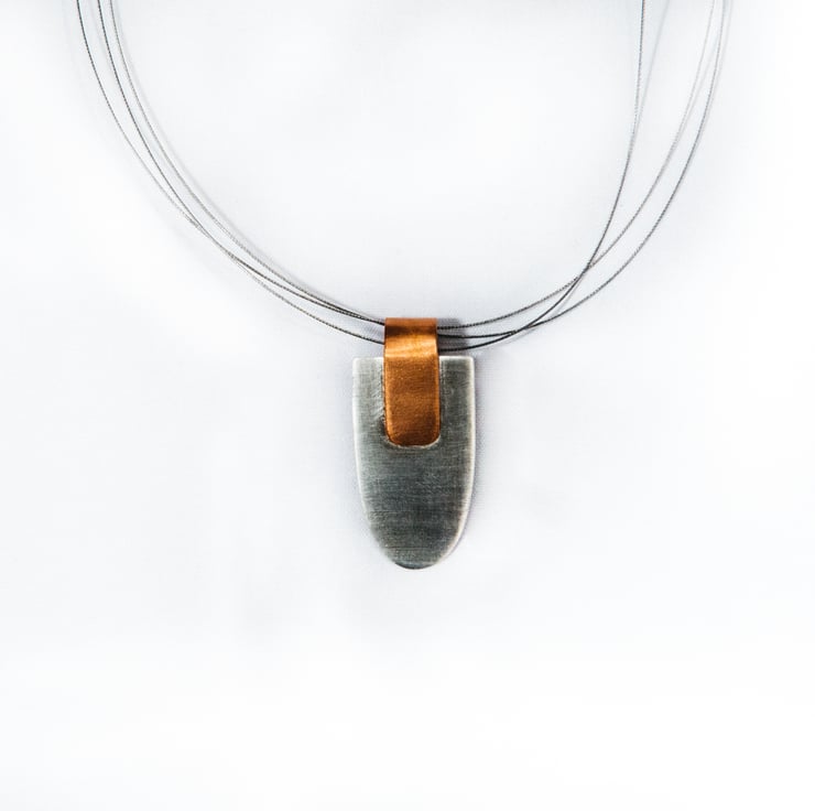 Sterling silver and copper pendant on 3 strands of silver cable wire with a sterling silver fastener.
