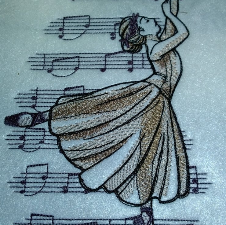 This beautiful music ballerina is stitched on to a felt backing that is hooped in an 8 inch close grain beech wooden hoop.