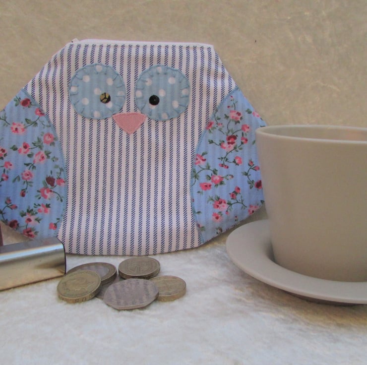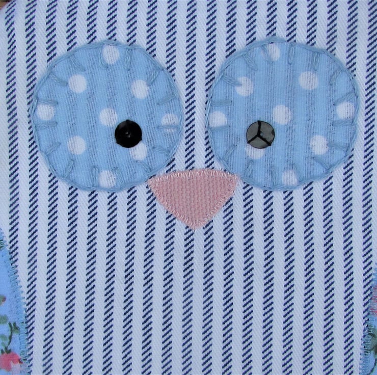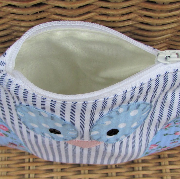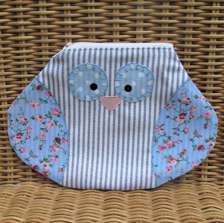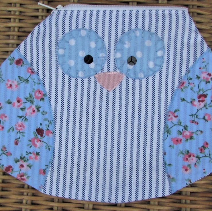 A delightful owl pouch which can be used as a small cosmetic bag or a large purse . The main body of the owl is a white and blue striped fabric and the wings are blue with a ditsy floral pattern in shades of pink and green. The beak is pale pink and the eyes are pale blue with white polka dots. The eyes are edged with hand-embroidered blue blanket stitch and embellished with black sequins.