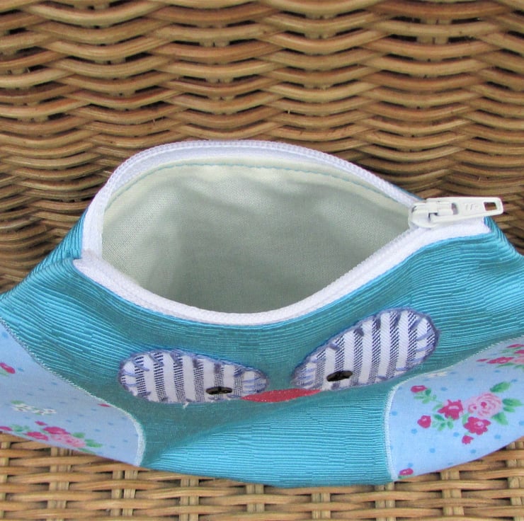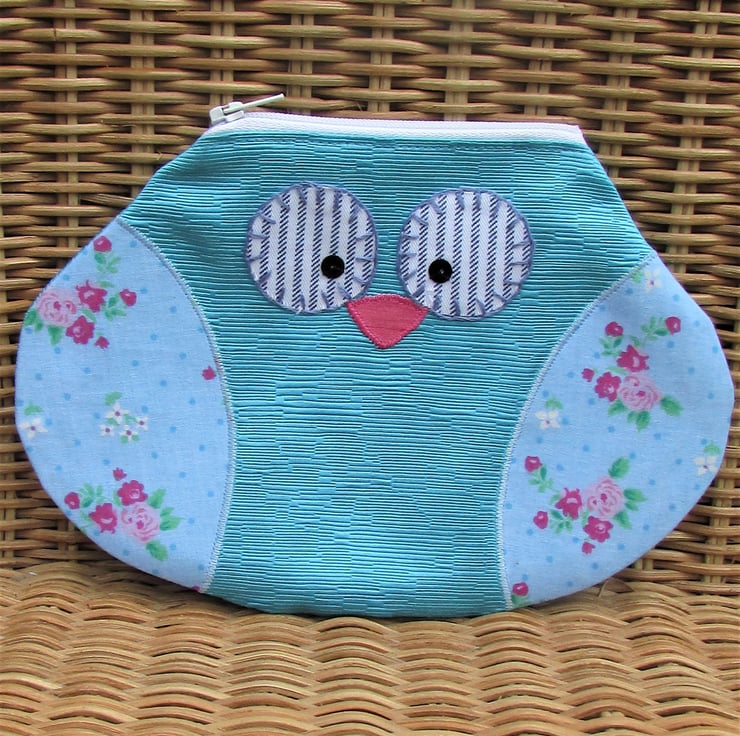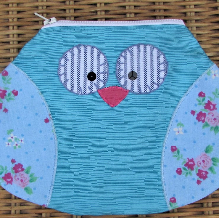 A lovely owl pouch which can be used as a small cosmetic bag or a large purse. The owl is made from a textured satin-finish turquoise fabric and the wings are pale blue with a pretty floral pattern in shades of pink, green and white. The beak is pink and the eyes are white and blue striped fabric. The eyes are edged with hand-embroidered blue blanket stitch and embellished with black sequins.