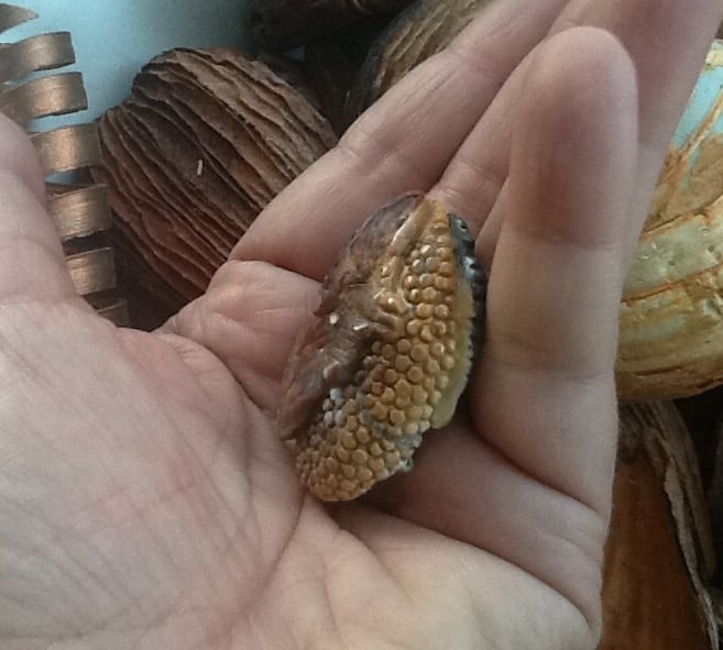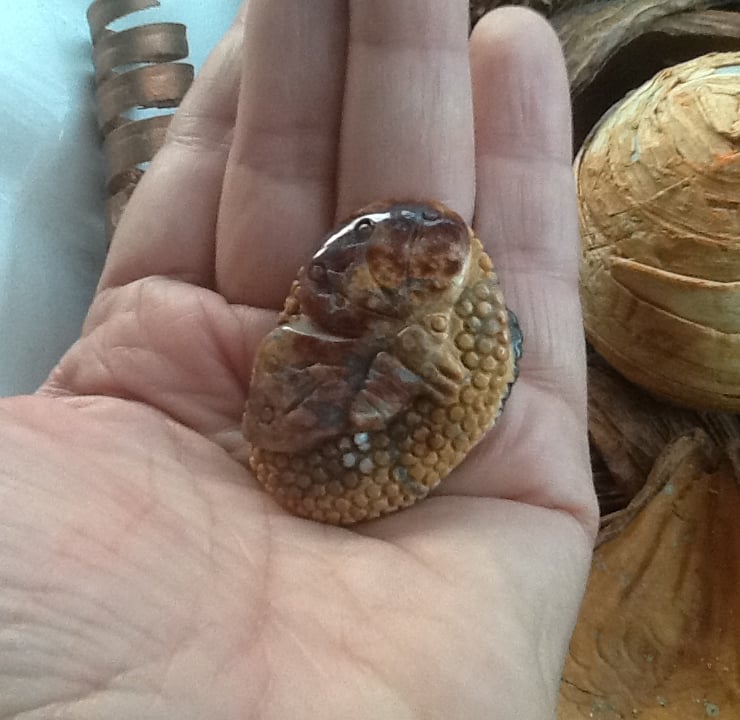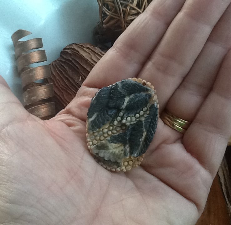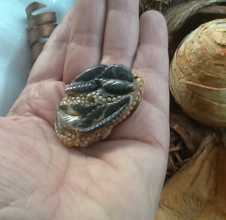 This Beautiful Gemstone bead is very substantial and carved all the way around with a stylised butterfly on one side and leaf fronds on the other side.