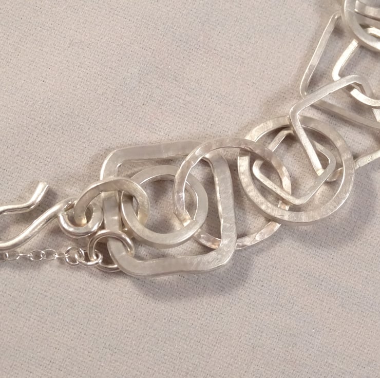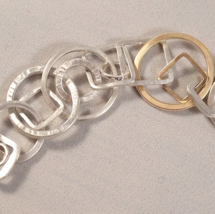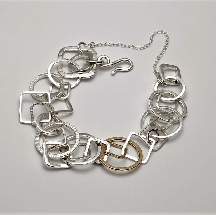 An organic collection of round and square links of various sizes with smooth and hammered finishes in sterling silver. Off-centre is a pair of yellow gold links. Secured using a solid S-shaped fastener with safety chain.