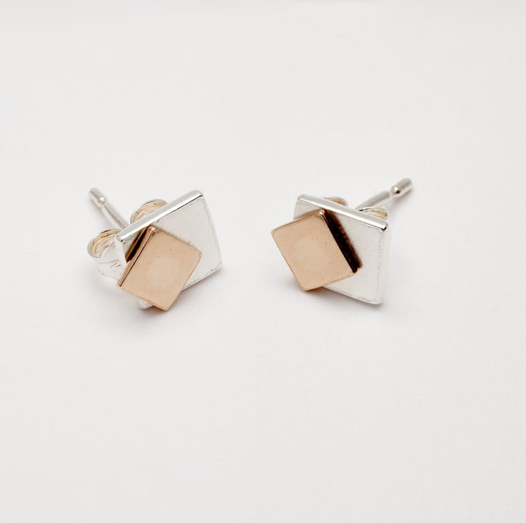 The sterling silver earring post is soldered to the gold square and passed through a drill hole in the larger silver rectangle before being passed through the ear and fastened. The gold square is completely movable and can be positioned at any angle in relation to the silver rectangle.
