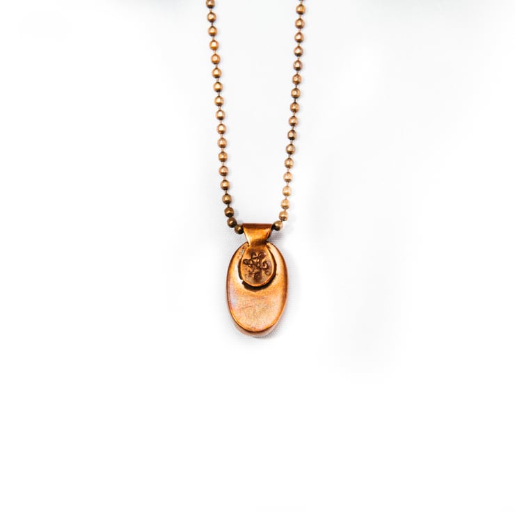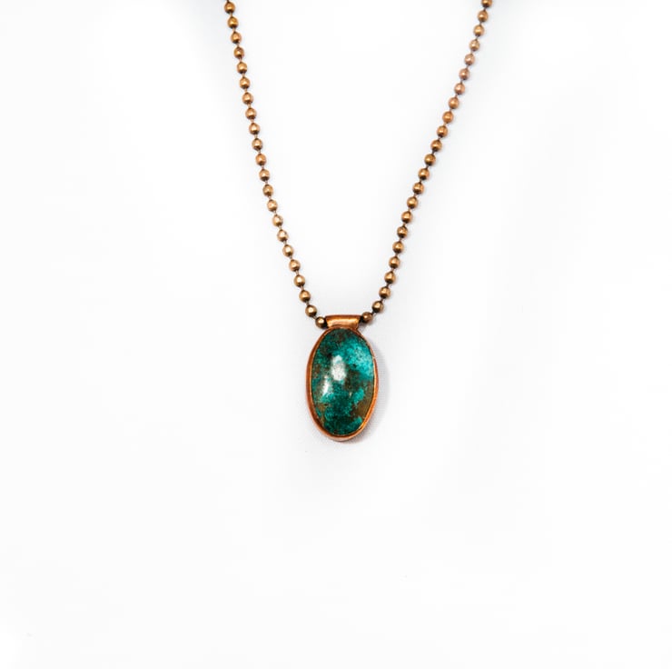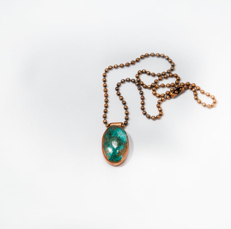 Peruvian turquoise (chrysocolla) set in antique copper with an antiqued copper ball chain. The stone blends subtle blue, green and brown hues.