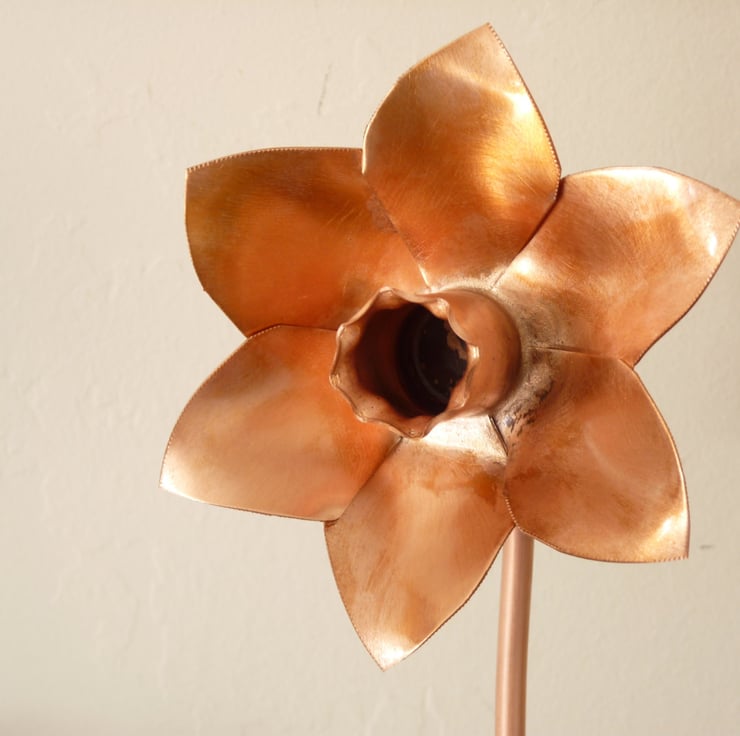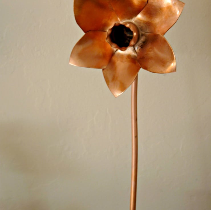 Symbolizing rebirth and new beginnings, the daffodil is virtually synonymous with spring, and this copper version will provide year round decoration to your home. Made from copper sheet and pipe, and then fame coloured and coated with a thin lacquer.