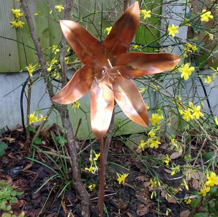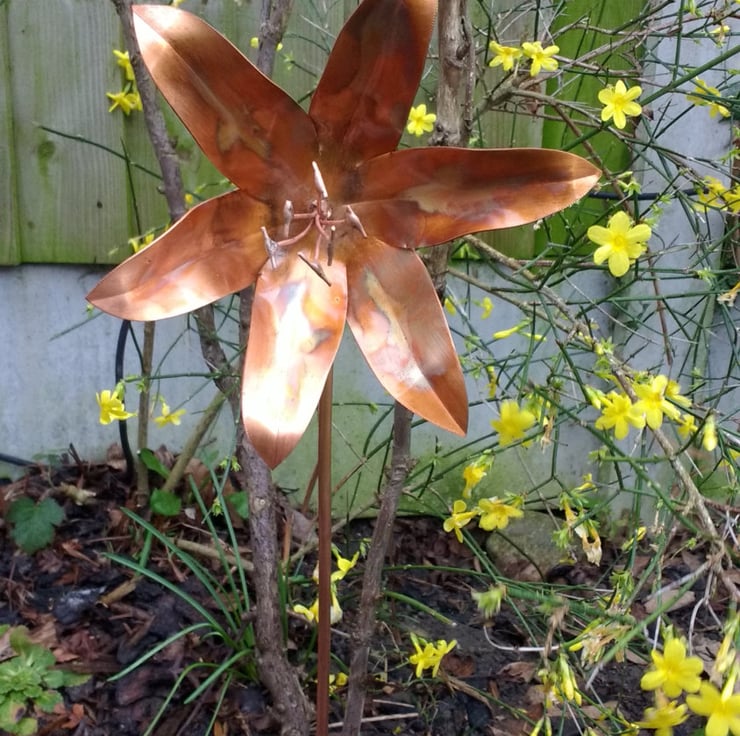 This delightful metal lily will provide year round decoration to any garden. Just push it into the ground in a suitable location from where you can then sit back and admire. They are coated with a thin lacquer to preserve the flame colouring, but they will weather in time and acquire a natural patina.