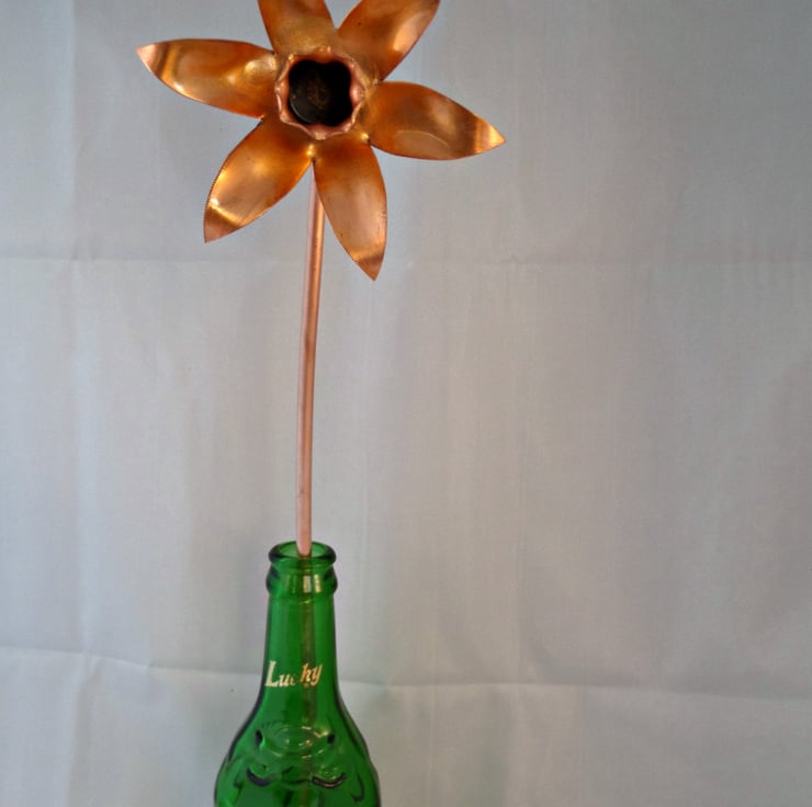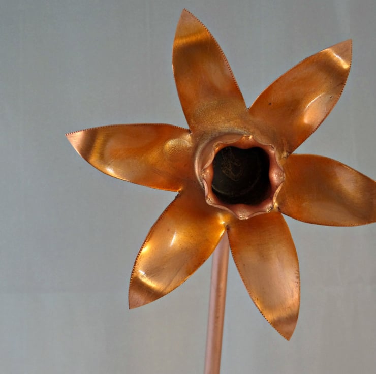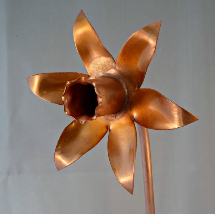 This copper daffodil will provide year round decoration to your home. Made from copper sheet and pipe, and then flame coloured and coated with a thin lacquer.