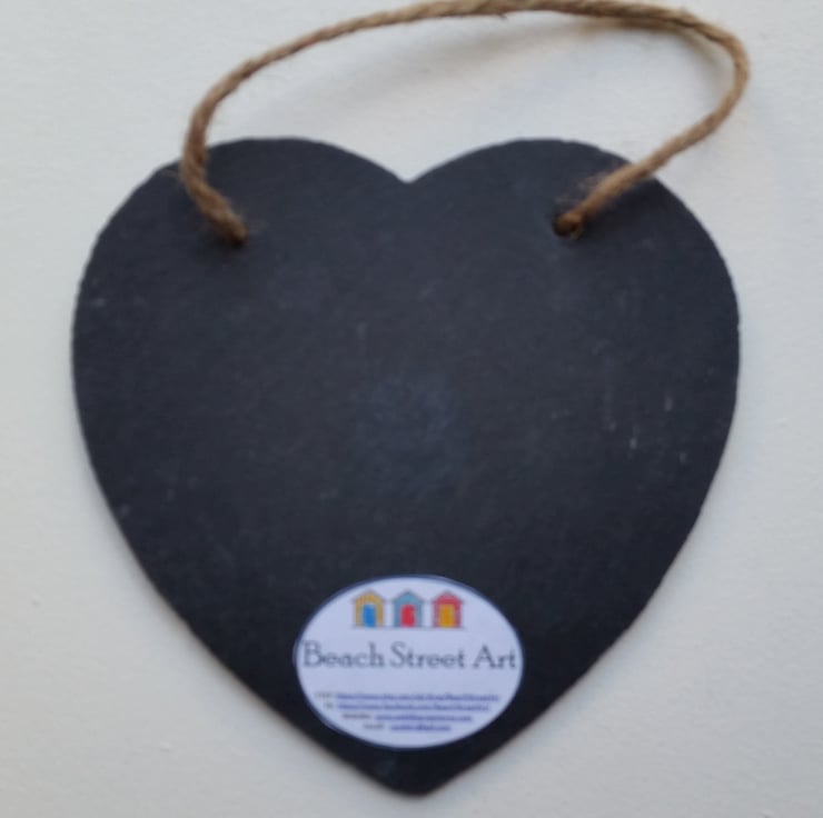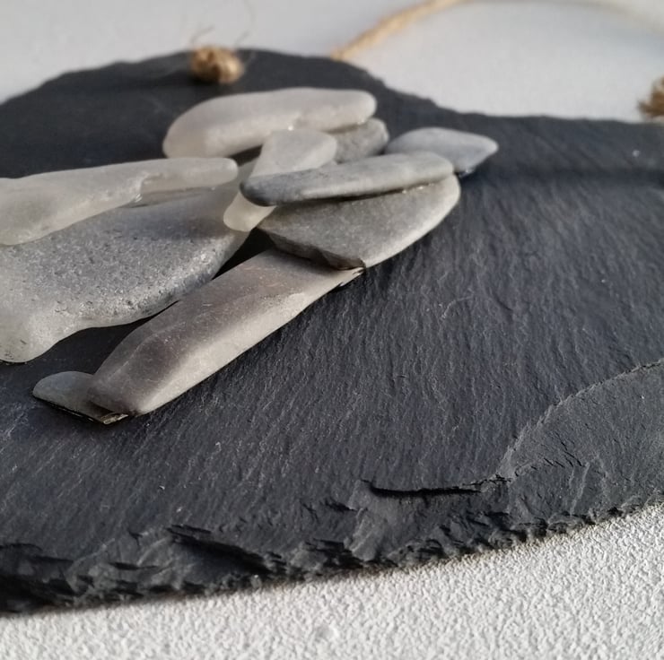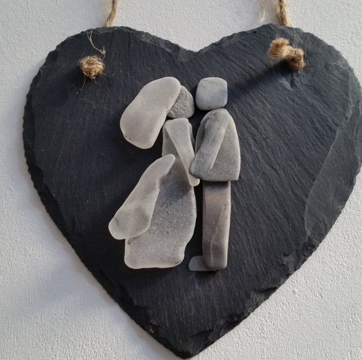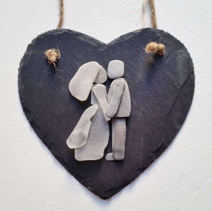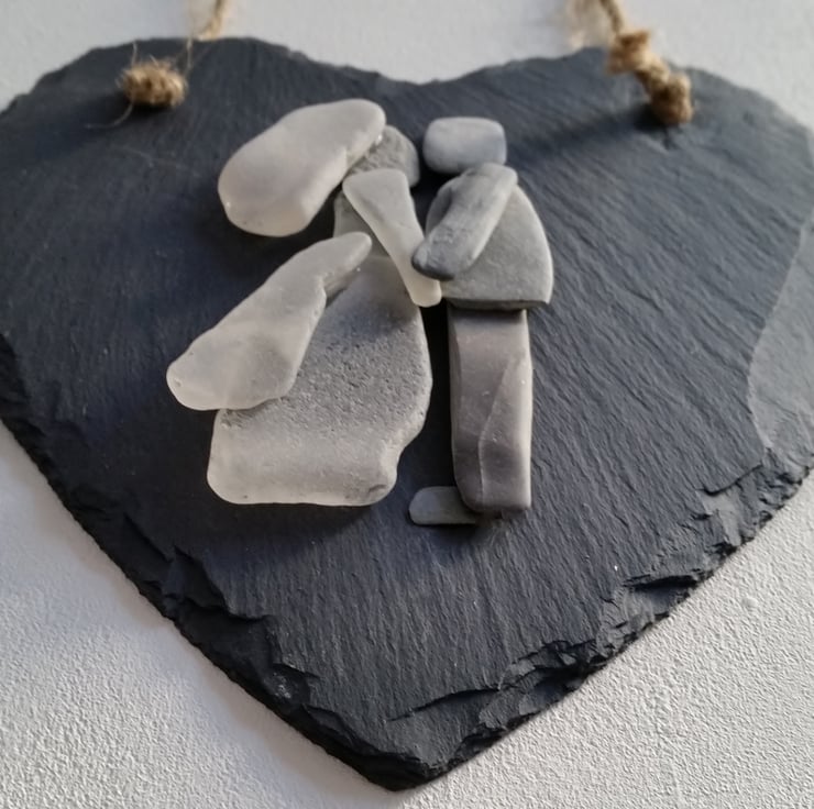 A sea glass and stone bride and groom set upon a 15cm x 15cm slate heart strung with jute ready to hang on the wall.