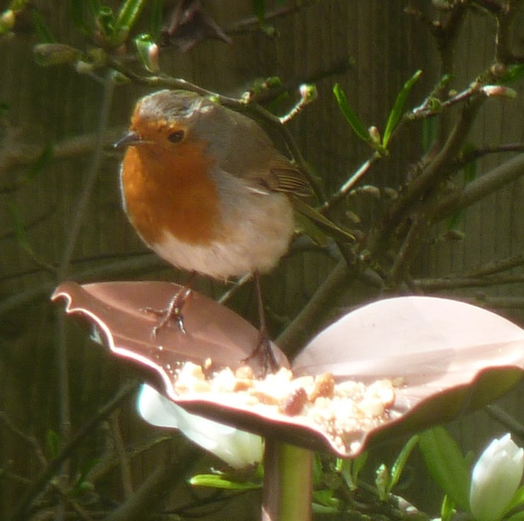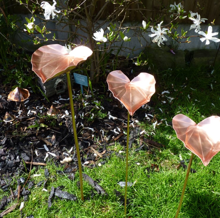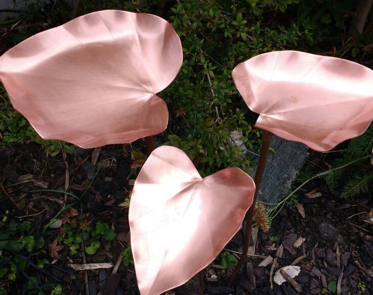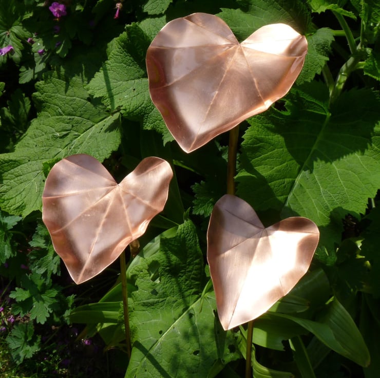 This set of three copper hostas would make a lovely garden feature. It can also be used as a bird feeder. The stems are not attached to the leaves. If you would like the stems fixed, you could glue them into place with a suitable weatherproof glue, or apply a small wedge alongside the stem to stop it moving, otherwise it will sway and move slightly in the wind, which adds to its charm.