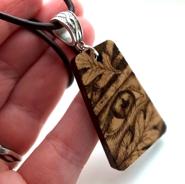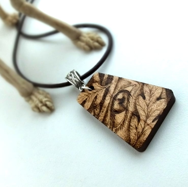 This listing is for a beautiful Elvish eye inspired pendant, with the little one peeping through the bracken, twigs and leaves, created using pyrography..