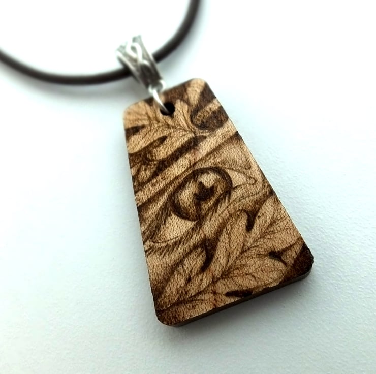 The pendant measures approx: 4cm tall, 2.5 cm across the base and 1.5cm along the top edge. The depth is 4mm. The wood is maple. After the design is completed, The pendant is varnished to protect the design.