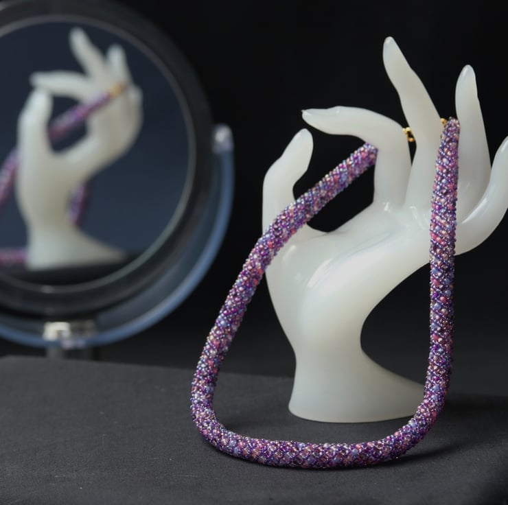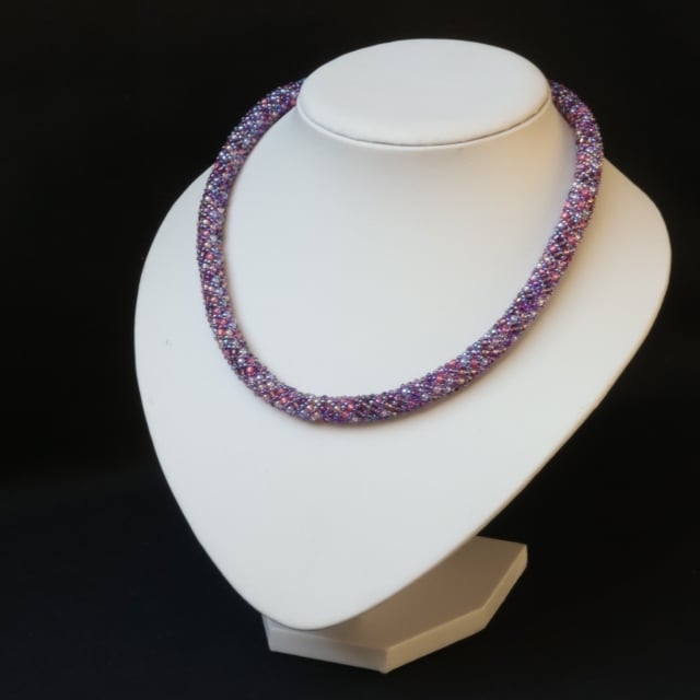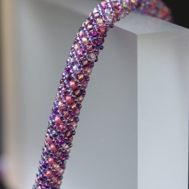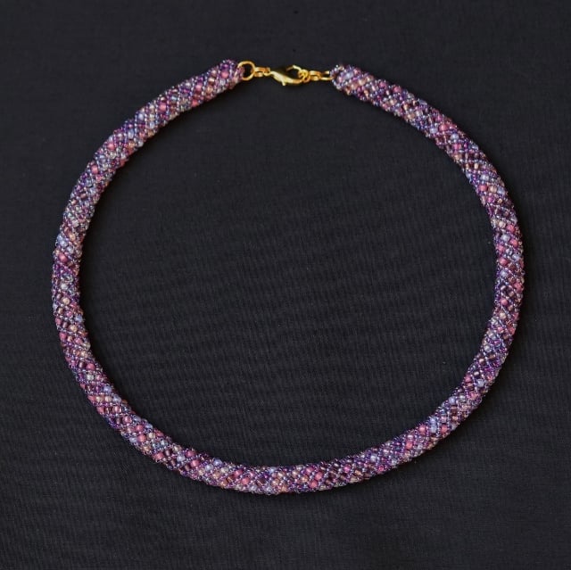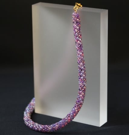 This pretty necklace is made from a seed bead mix of many shades of pink, purple and mauve. These run in spirals around rows of smaller seed beads in a pretty purple iris colour. All the beads are high quality Japanese Miyuki and the necklace has been stitched using Fireline beading thread which is renowned for its strength. The beading pattern used to make the piece is Russian Spiral which has many varieties but which gives a lightweight but substantial beaded rope, due to the necklace being hollow inside. The piece is completed by a gold-plated trigger clasp.