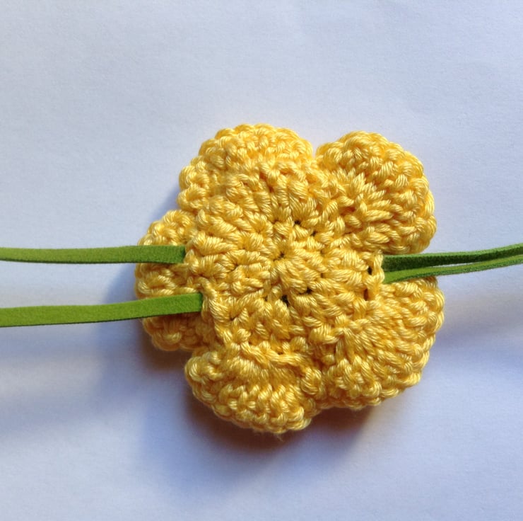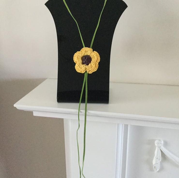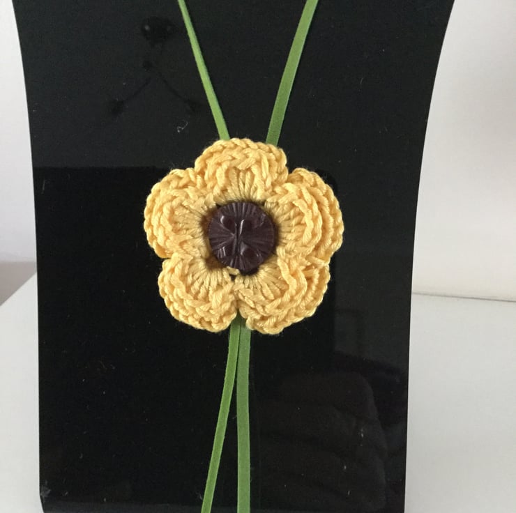 I have crocheted this pretty flower in a sunny yellow cotton yarn and added a decorative brown button in the centre. It is on green faux suede cord with beads on each end.