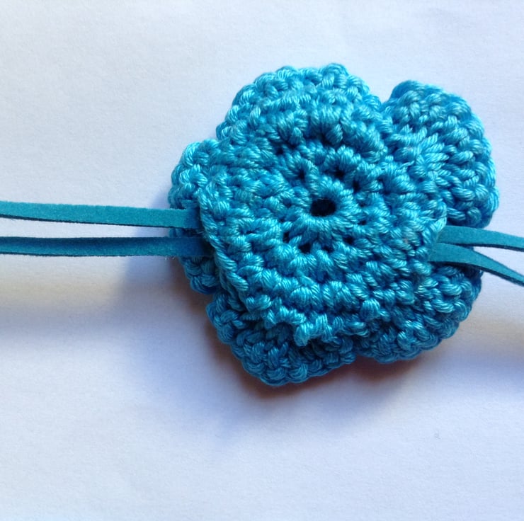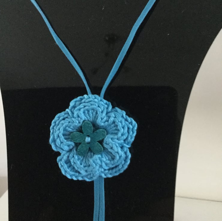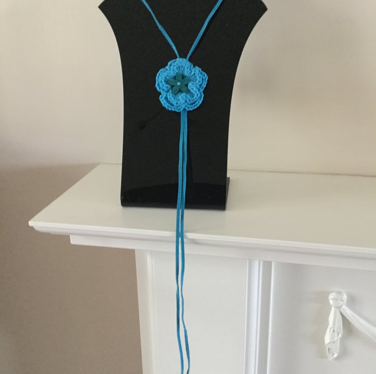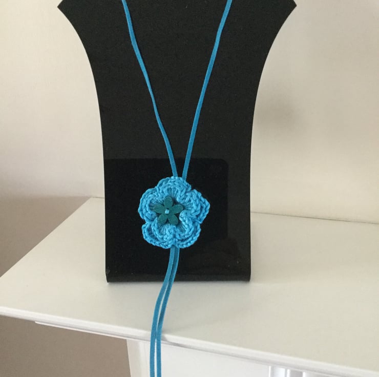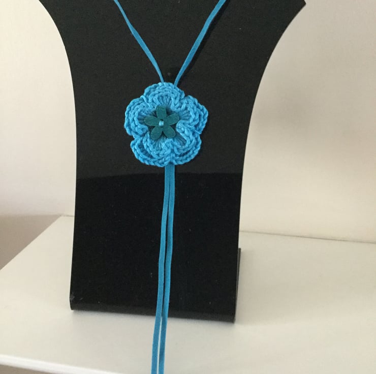 I have made this flower in gorgeous turquoise cotton yarn and added a decorative wooden flower button in the centre. It is on a turquoise faux suede cord with beads on each end.