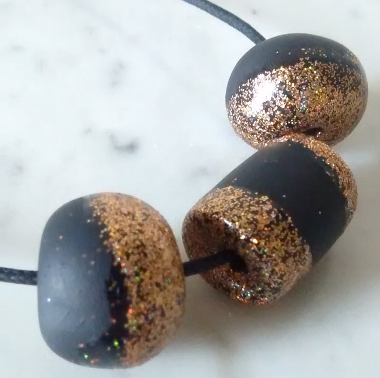 Beads have been dipped in fine Gold Glitter then baked in the oven.