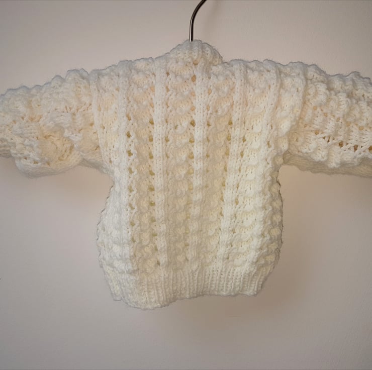 This lovely cardigan has been hand knitted in cream baby yarn.