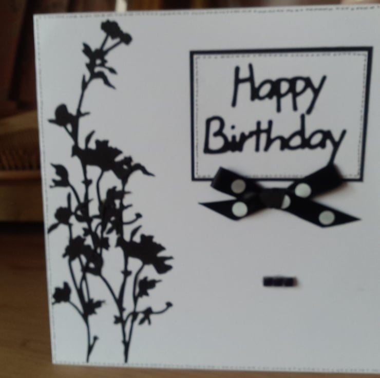 A completely handmade and uniquely designed card. Consisting of pristine white card which has wildflowers die cut from black card. Happy birthday cut from black card. Finished off with a black/white dotty ribbon and a row of black rhinestones
