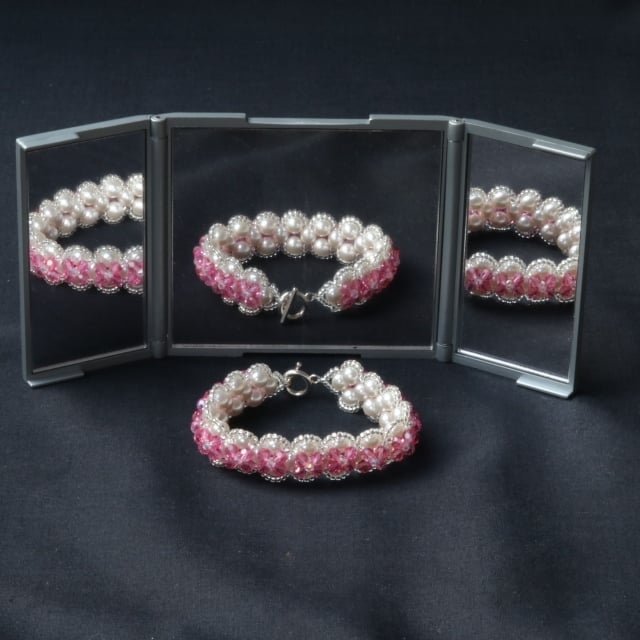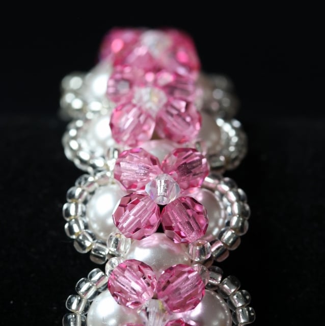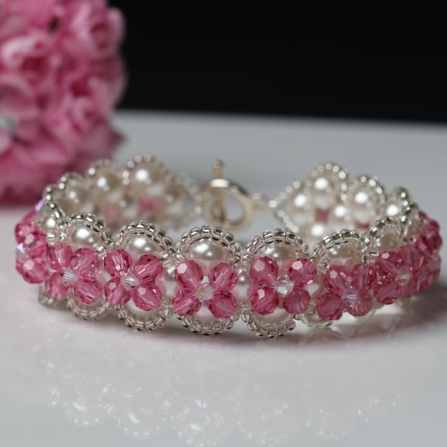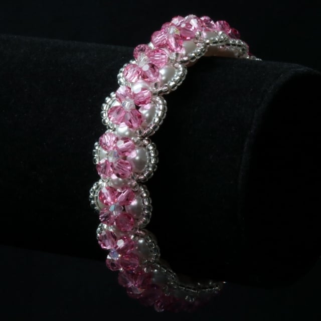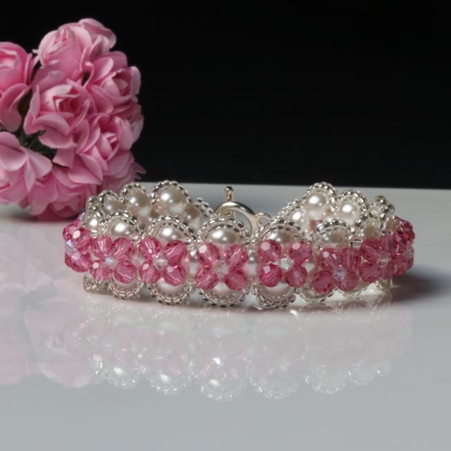 This stunning piece is a right angle weave of high quality Swarovski white glass pearly beads overlaid with tiny silvery seed beads, sparkly pink 4mm round rose coloured Preciosa crystals and little 3mm bicone crystals. Because of the two layers it has a very substantial, opulent feel and look. It is elegant and would look lovely on a bridesmaid or would make a beautiful present for someone special.