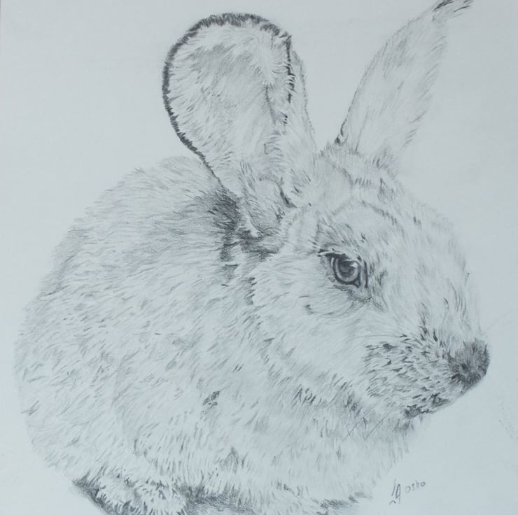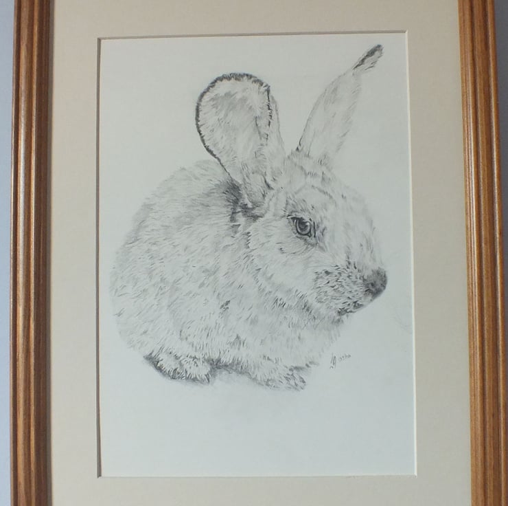 An original pencil drawing of a rabbit drawn using a copyright free image. The drawing is framed and mounted and was drawn in May 2010. The drawing measures 21cm x 28cm (8 x 11”) including frame.