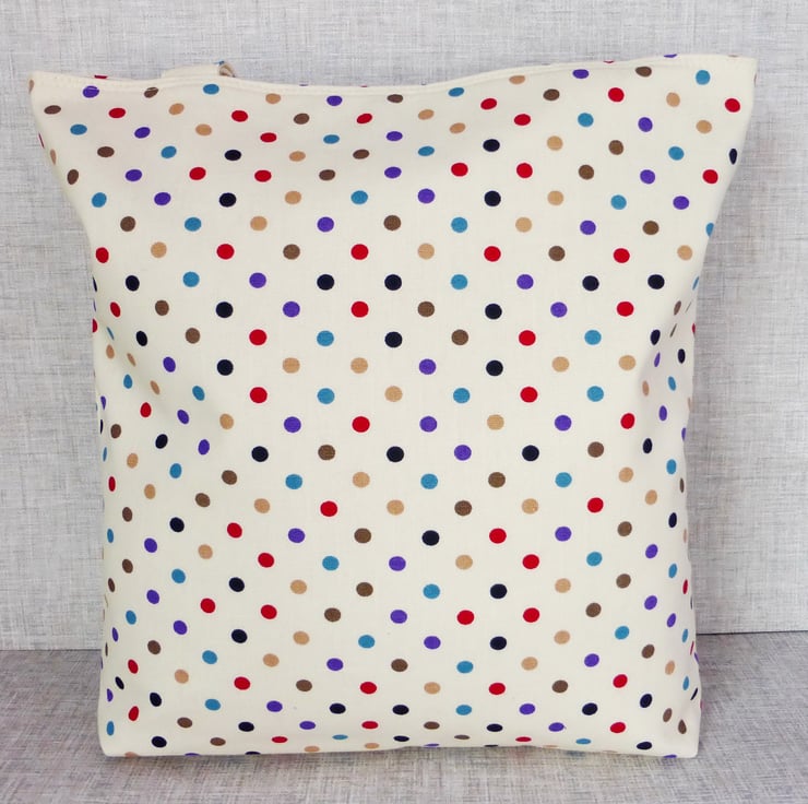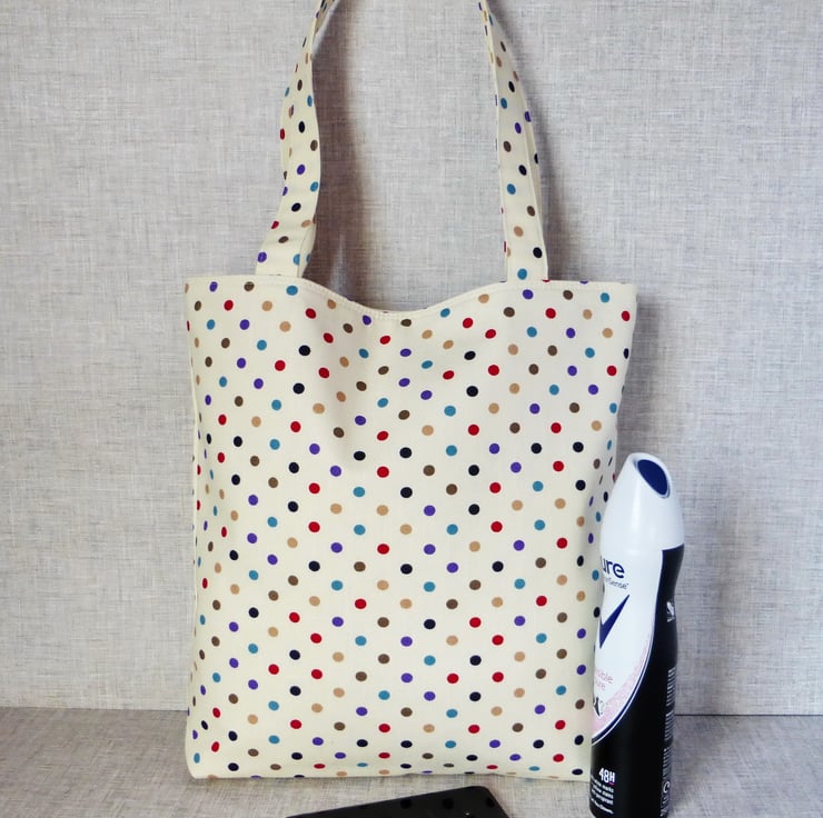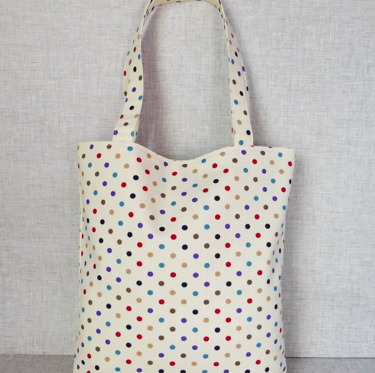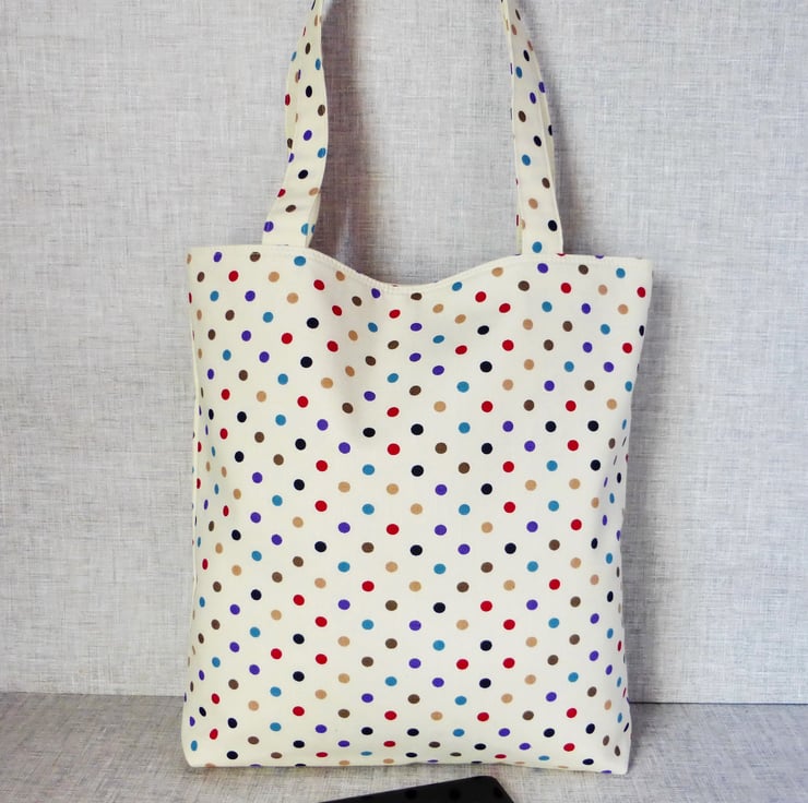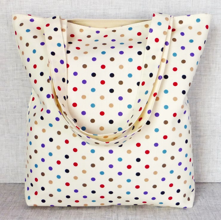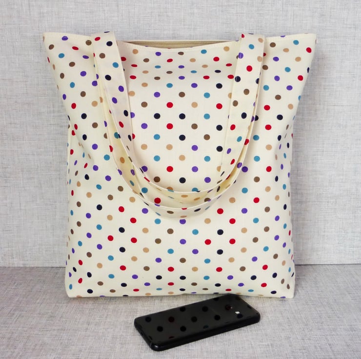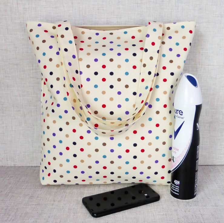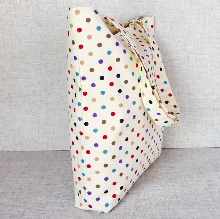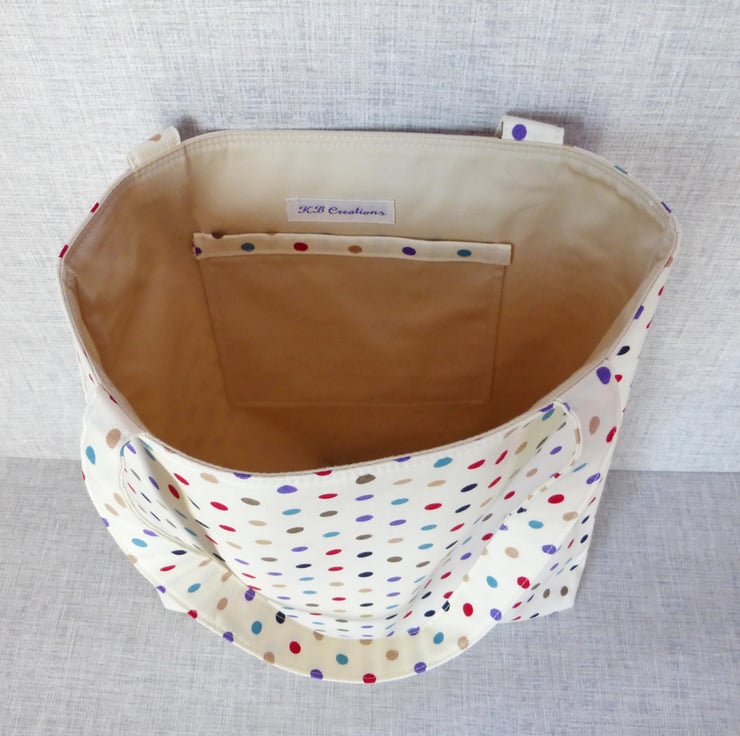 A medium sized strong tote bag/shopping bag made from cotton canvas fabric with spots in various colours on a cream background. The lining is a sand coloured cotton twill fabric. Inside the bag is one slip pocket, ideal for you shopping list, phone, keys etc.