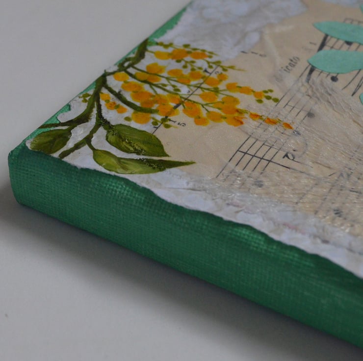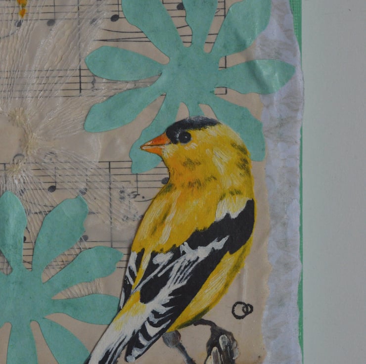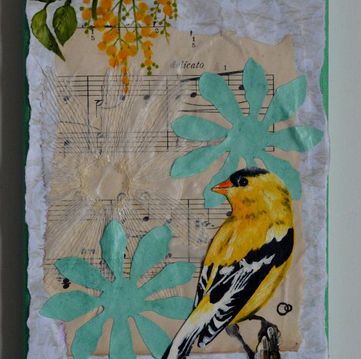 The yellow bird has been painted onto paper using acrylic paints and cut out. I have also painted directly onto the surface, as well as added some more cut-outs.