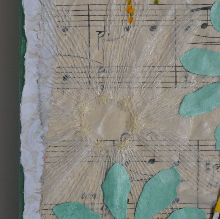 When I am making collages I like to layer materials especially when I am using sheet music, as I like to be able to see fragments of the music visible through other materials. I usually use tissue paper applied with PVA glue, however for this piece I came across a small piece of ivory embroidered organza I had been holding onto for some time. I originally aqcuired it in a bag of bridal scraps and kept it knowing that it might come in handy. This has been layered onto vintage sheet music.