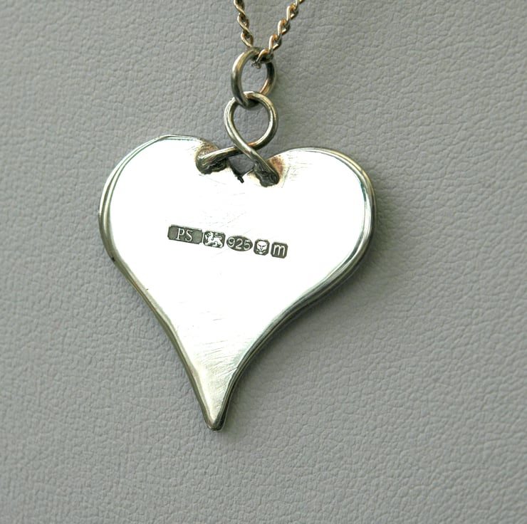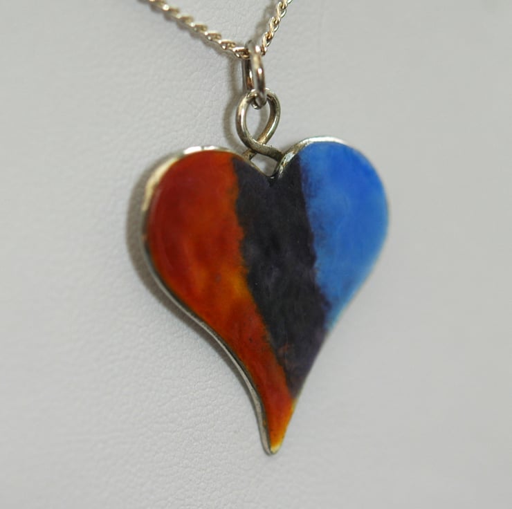 This sterling silver heart pendant is a one-of-a-kind sample item, part of an early venture into enamelling. It would make a unique Valentine's gift. It was hand-cut from sterling silver sheet and had an integral bail added before applying the enamel in a striking combination of orange, blue and dark purple-grey. The pendant is quite substantial, measures 2.8x2.8cm and has been hallmarked on the back by the London Assay Office. It comes supplied with an 18inch (45cm) sterling silver trace chain, packaged in a pretty organza bag and sent by first class post.