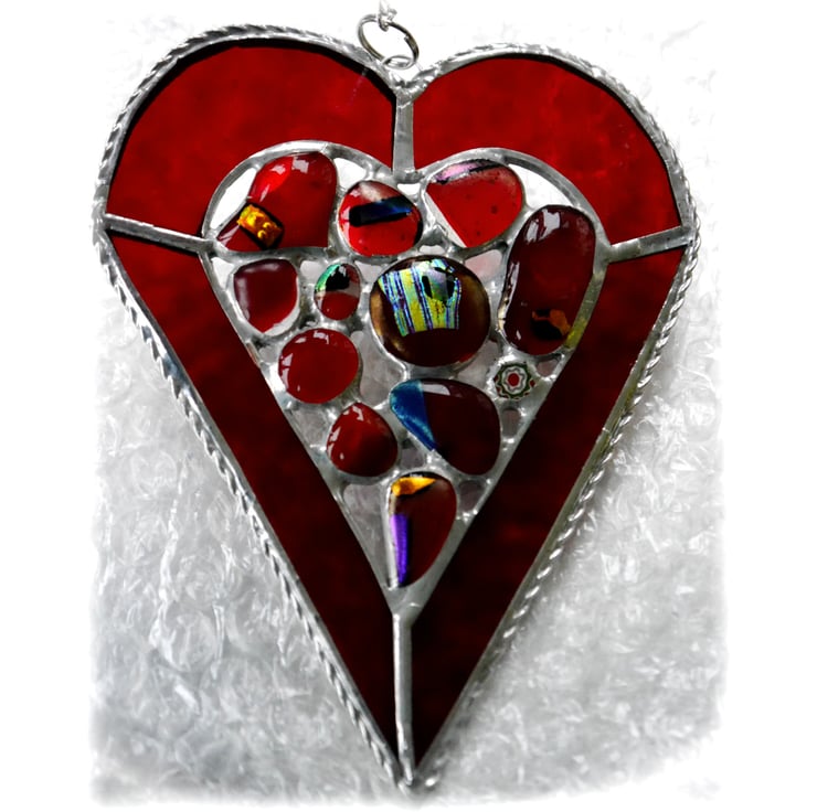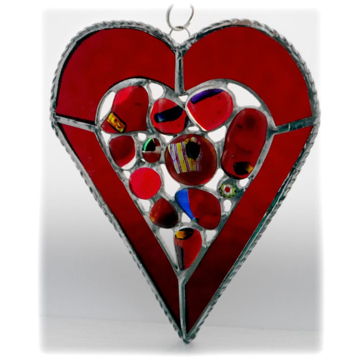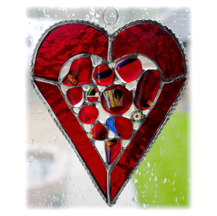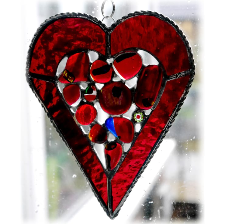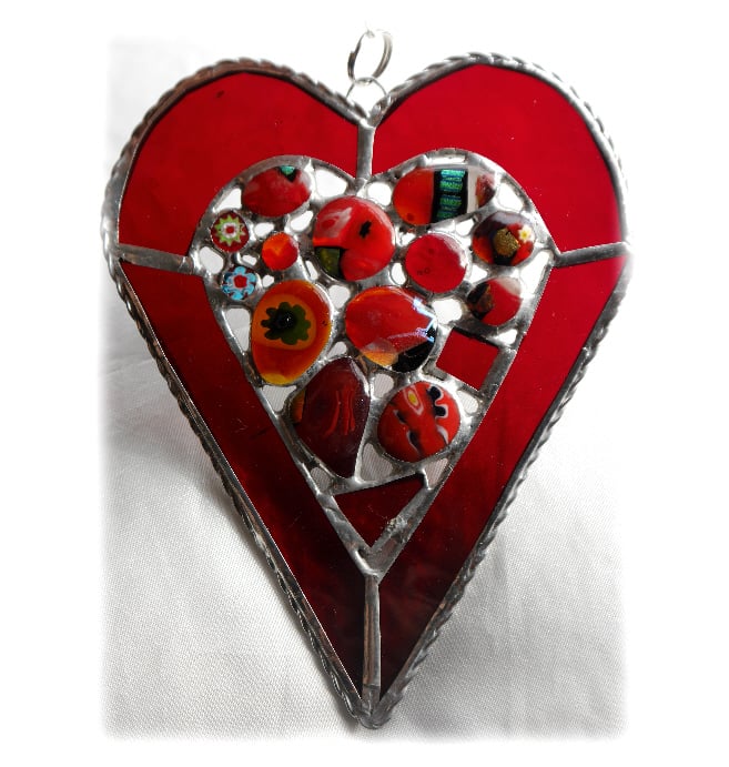 It is 14cm x 11cm and the heart border is cut from bright red textured glass which is strengthened round the edge with twisted wire..