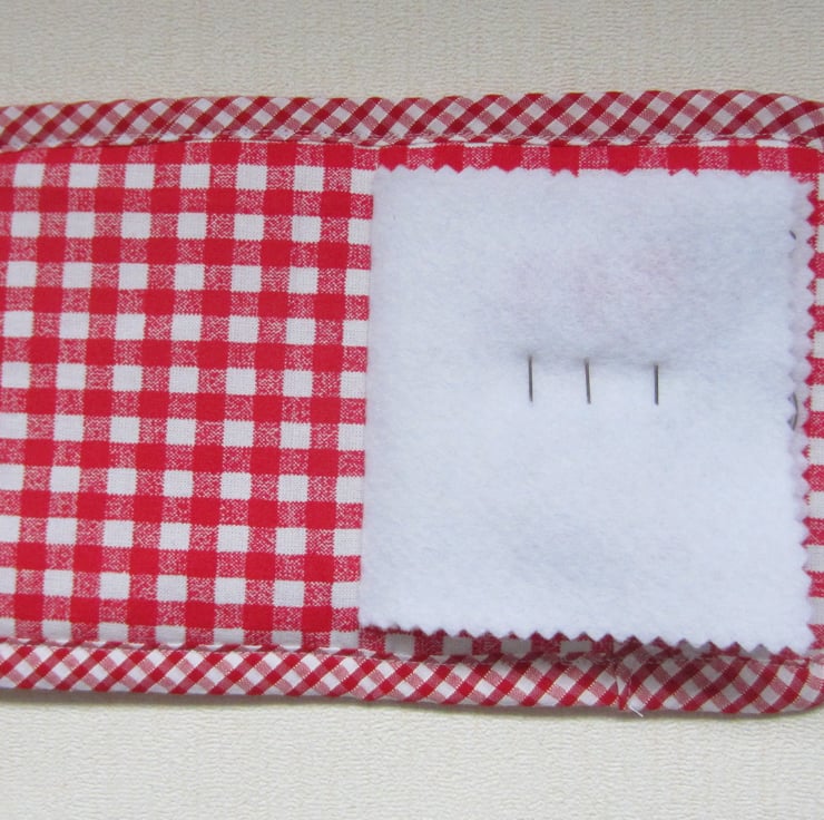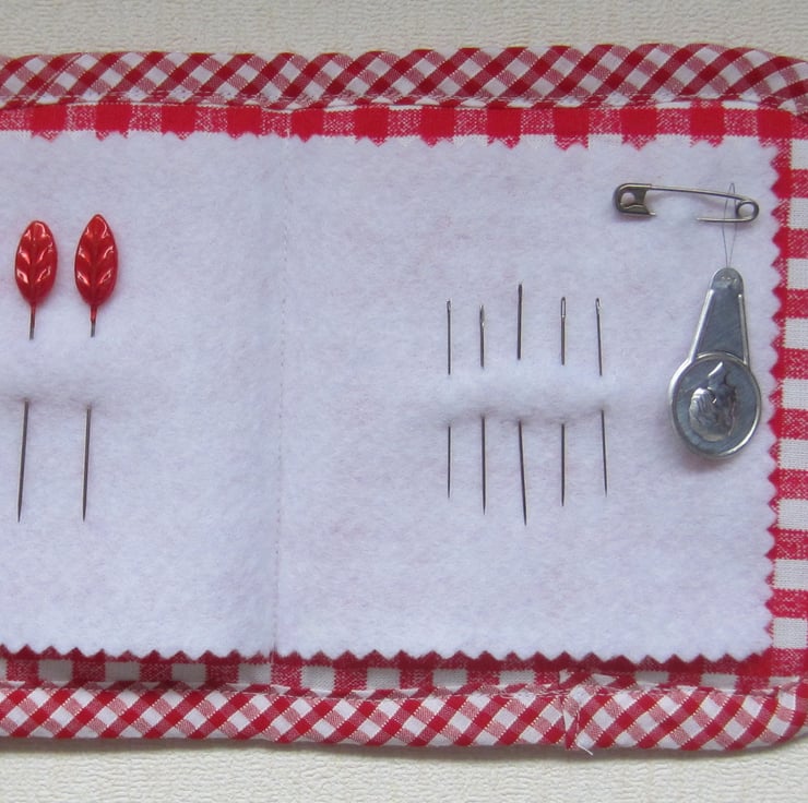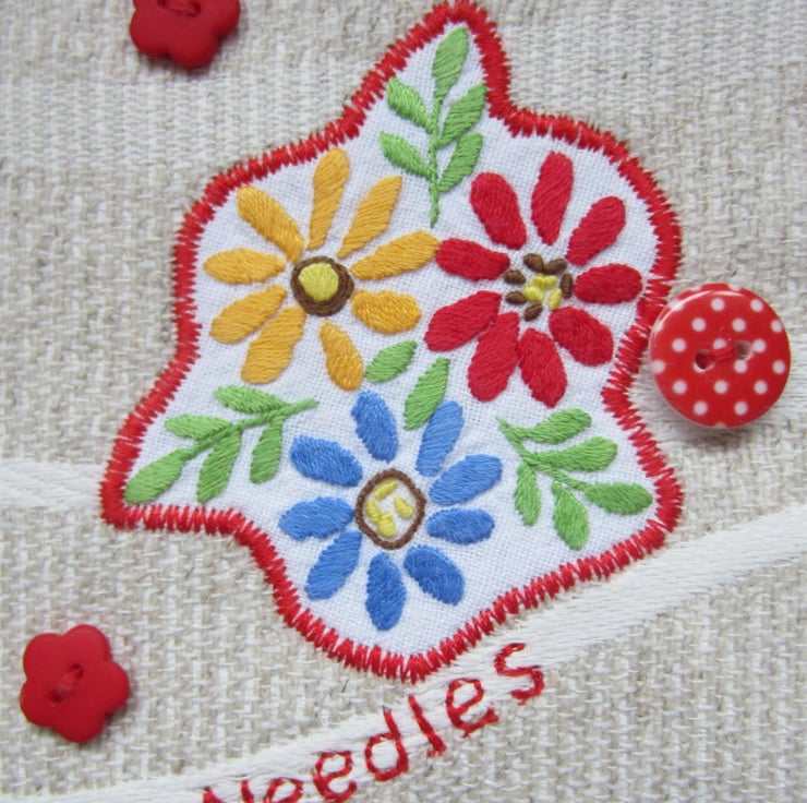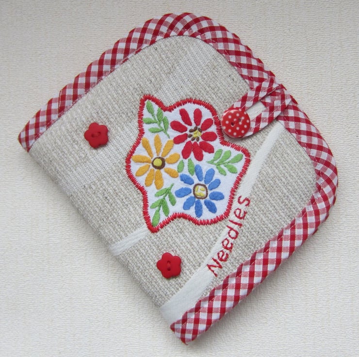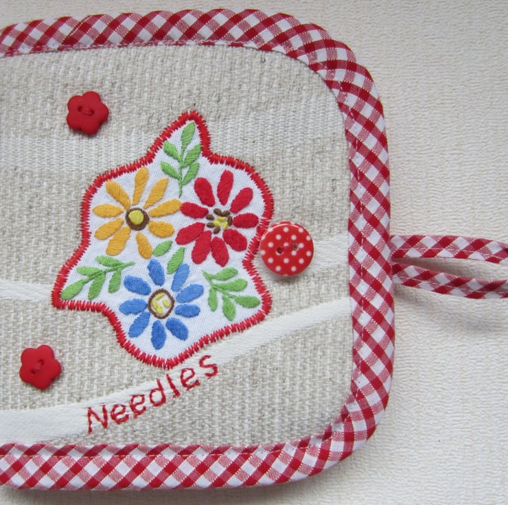 Lightly padded sewing needle case with appliqued vintage embroidered flowers and red flower buttons on a fawn background. Lined with red check and edged in red and white gingham. Inside there is a white felt page complete with pins, needles and a threader.