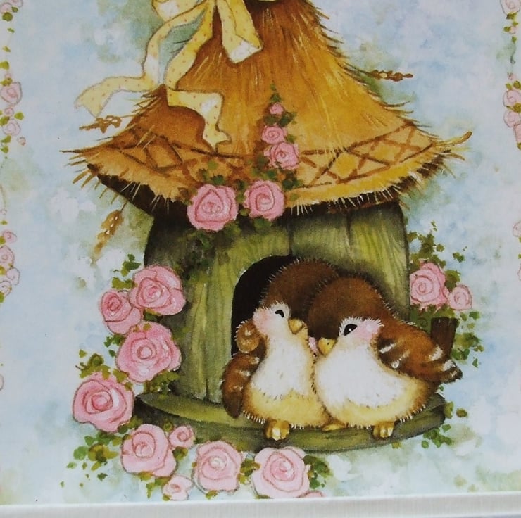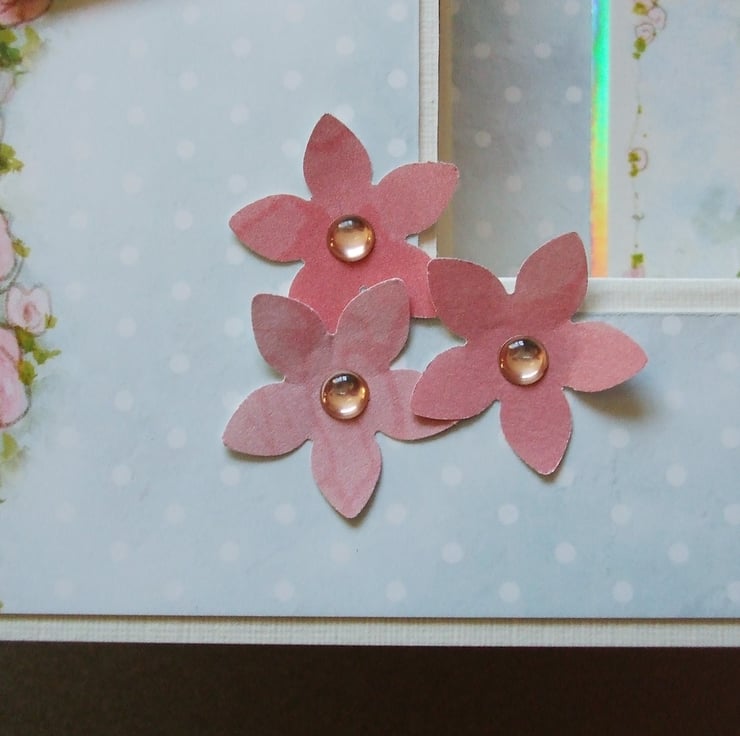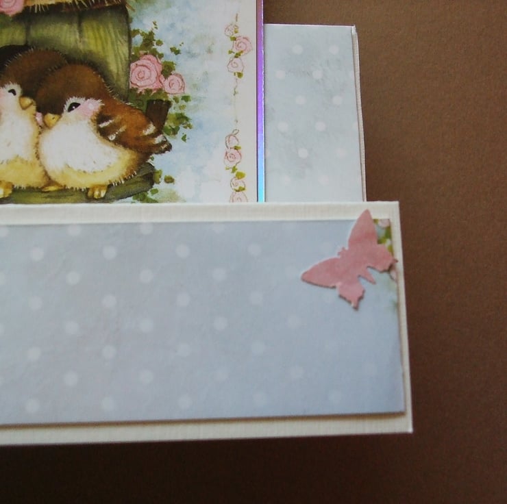 The cream base has been cut and folded to give a stepped card making it stand out from the more 'ordinary' cards on the mantlepiece, however it still folds flat to be put in the envelope. I've cut card patterned with pink roses on a pale blue background to match in shape. The topper features 2 love birds outside their cute thatched birdhouse, it has been layered onto silver foiled card that has a pastel rainbow finish which changes colour depending on the angle you look at it, I've placed the topper on the inner 'step' leaving the front free for a name to be added if you wish. The greeting has been placed on the tall side of the card using 3D foam pads and I've added paper butterflies and flowers with glossy 'dewdrop' centres.