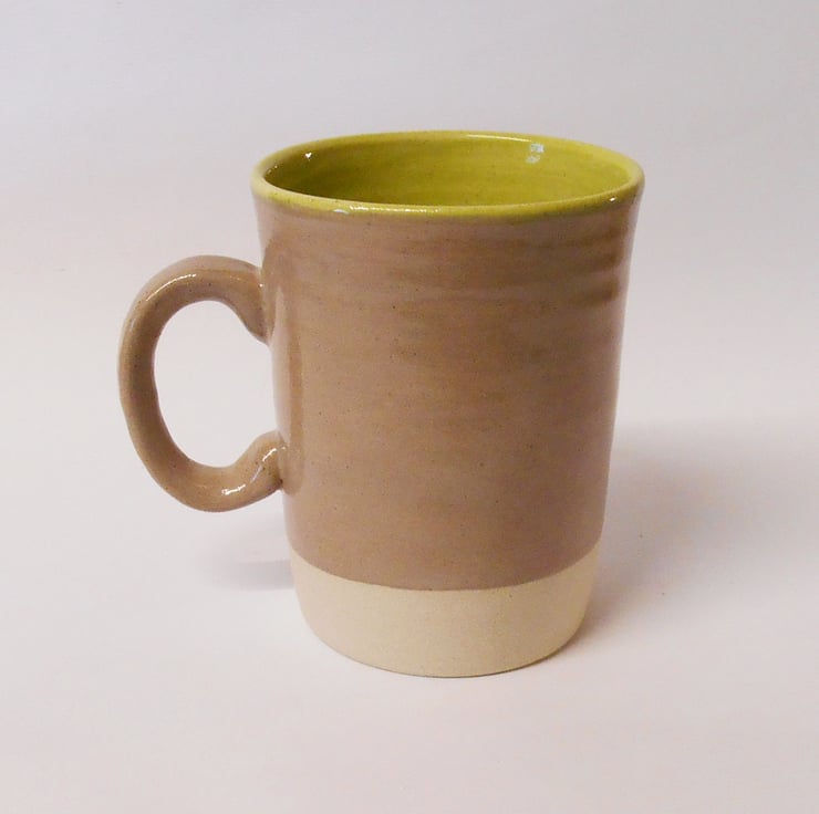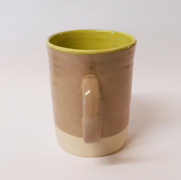 Wheel thrown stoneware ceramic Mug, hand glazed on the interior with shiny Grass Green glaze, and dipped into Grey shiny finish glaze on the outer part of the mug. My Unique Potters stamp appears on the base. It is 11 cm high, the top is 8.5 cm across, and the base is7 cm across.