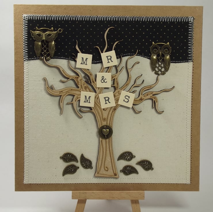 I have made the background of the card from fabric. The tree is wooden and Mr and Mrs Owl are sitting in the branches. There is handmade wording in the tree and a beautiful love heart on the trunk.