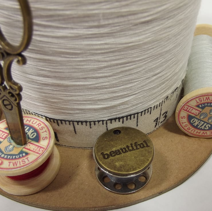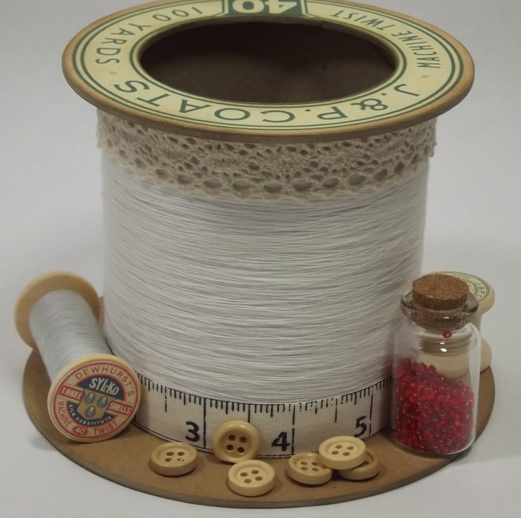 These cotton reel pots are made from very thick board, with proper cotton thread wrapped tightly around them, giving them that authentic "bobbin" appearance. I have decorated the base with "all things cottony" including smaller filled cotton reels, loose buttons and an antique gold coloured pair of sewing scissors' ... just like Granny's old sewing box ..... a delightful gift for the "sewer and stitcher" in the family.