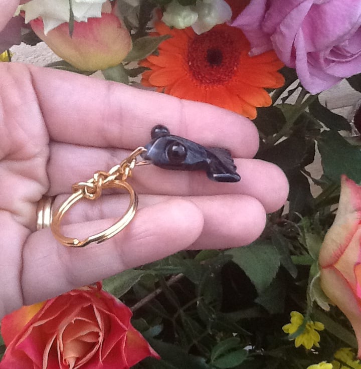 Beautifully tactile and glossy carved little Dragon Eyed Goldfish Agate Gemstone Keyring, or handbag charm, with gold tone findings.