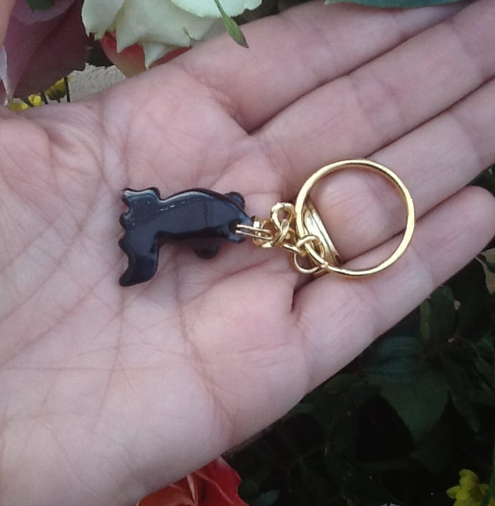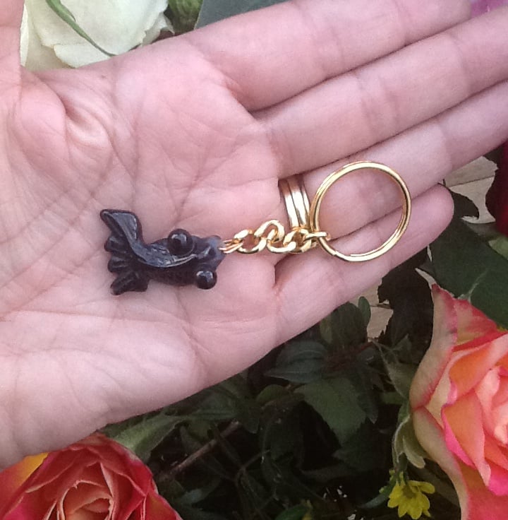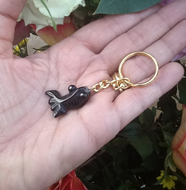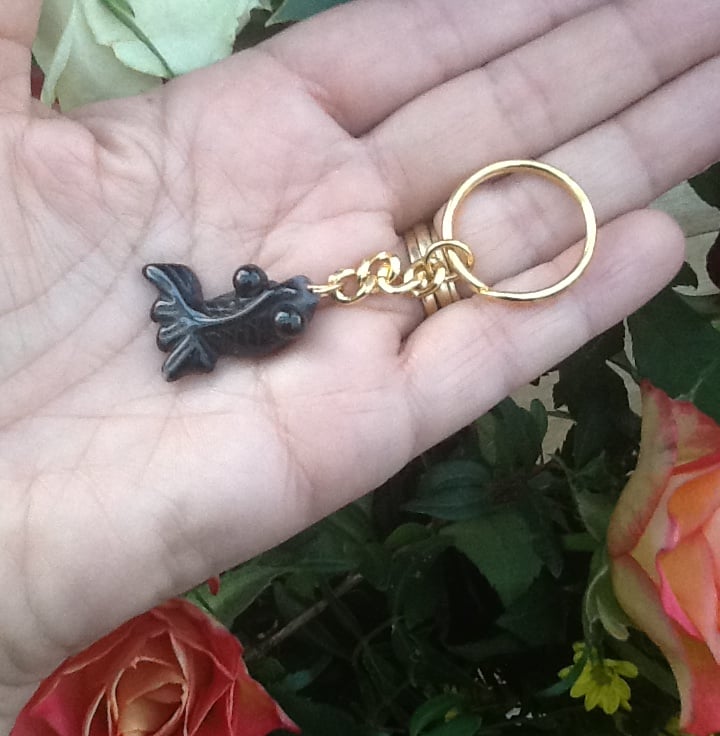 The goldfish has been simply drilled through the area of the mouth, through which I have placed a gold tone triangle bail & keyring findings. To complete this item as a usable keyring, or handbag charm the item has been finished off with a 2.5cms diameter gold tone round split ring.