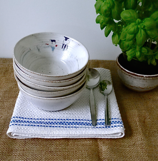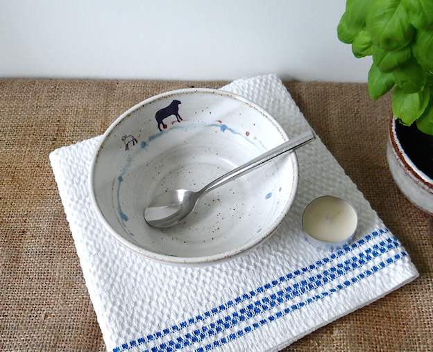 A generously sized handmade bowl for cereal, soup, pasta, rice and desserts. I made it from strong flecked stoneware clay and finished it off with two cute lamb images drawn by Zanna - zannaallenillustration.co.uk. Fired into the glaze at over 800 degrees C these images will not mark or fade over time.