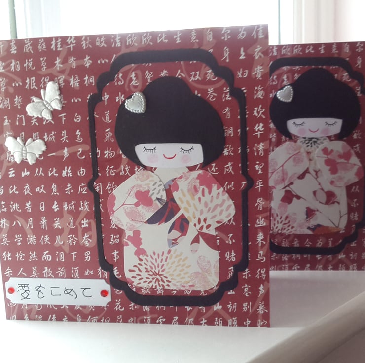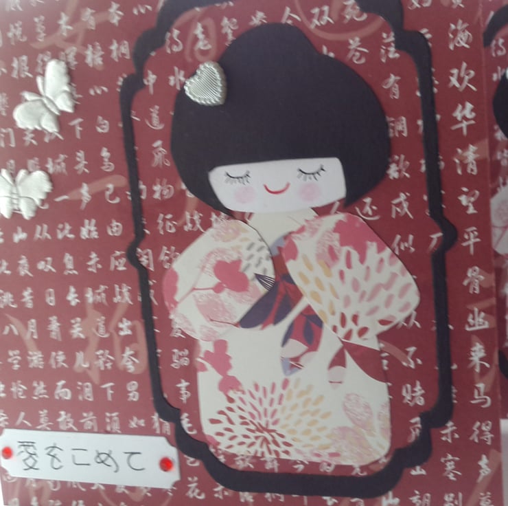 A completely handmade and uniquely designed card. Consisting of a kokeshi doll handcuffs from pretty oriental paper. The hair has a pretty pearl heart. Mounted within a die cut black frame. Mounted onto Chinese printed paper and then onto pristine white quality card. A tag with love handwritten in black in Chinese script. Finished off with two pearl fabric butterflies