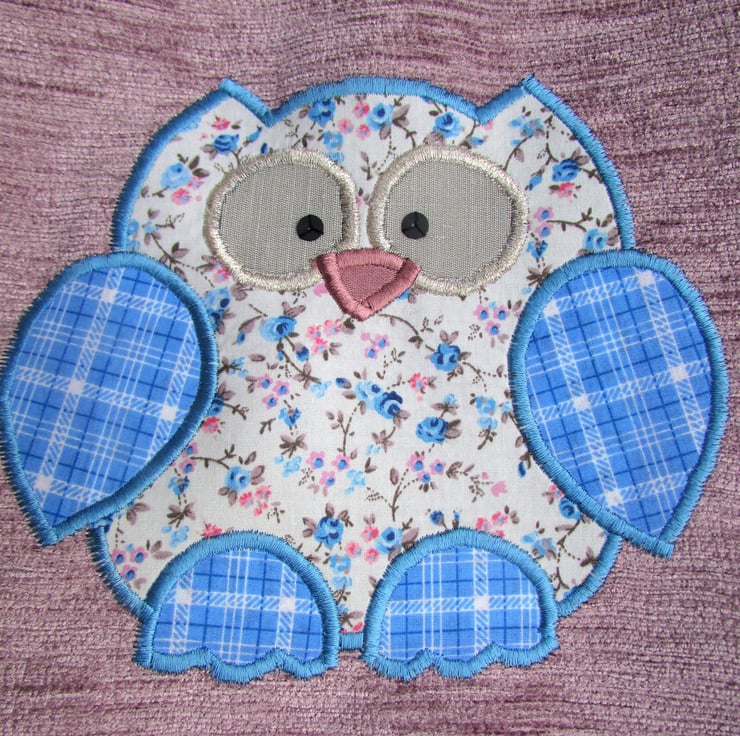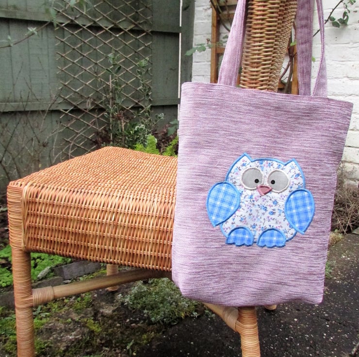 A cute owl tote bag in luxurious textured lilac fabric with an adorable applique owl. The main body of the owl is made from a ditsy floral print fabric in pretty shades of blue and lilac on a cream background. The wings and feet are a lovely blue and white checked fabric. The owl has a dusky pink beak and silver satin-finish eyes, edged with silver thread and embellished with black sequins. The bag is fully lined with fabric which matches the main body of the owl.