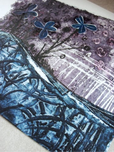 The nature of collagraphs means the print has a painterly feel to it as well as the paper itself feeling embossed in areas. This is due to the fact that the paper is wet before it goes into the press. The textured collagraph plate indents or embosses some areas.