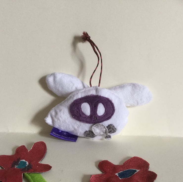 Soft white plush body and wings. A Purple plush face, silver plush dandelion and grey plush paws.