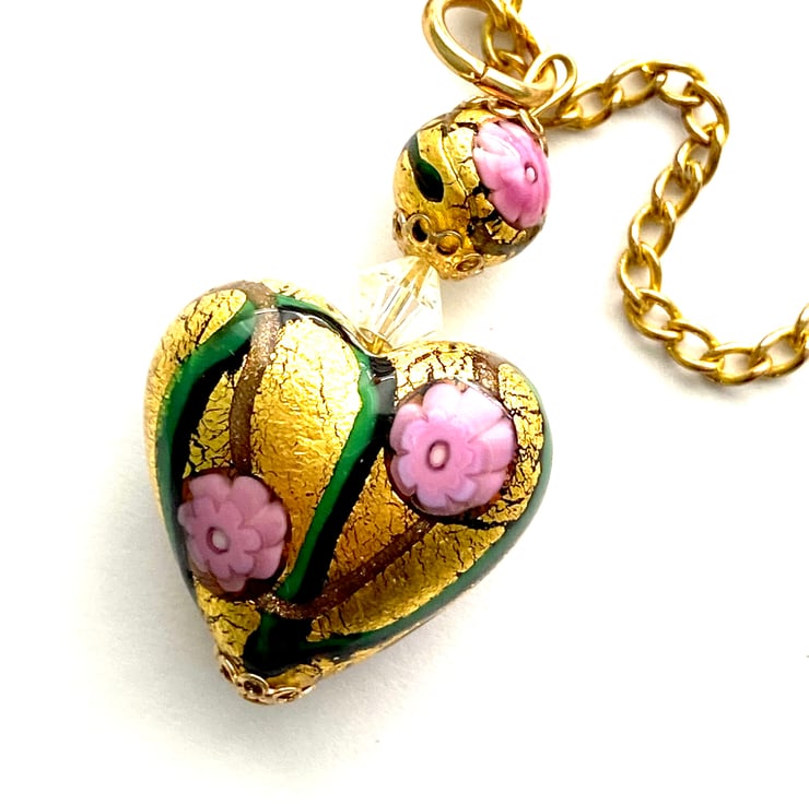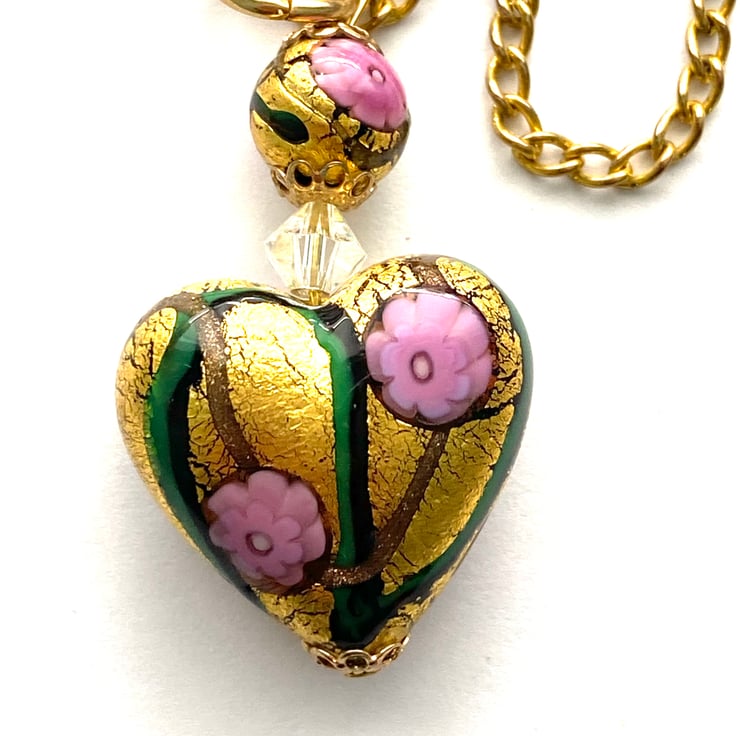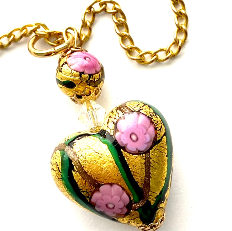 Murano glass pendant with a 24k gold foiled pink and gold decorated Klimt style Murano glass heart (20mm) with a matching 24k gold foiled Murano glass round bead and a Swarovski crystal bead (30mm in height). The beads are beautiful with pink and green flowers and leaves scattered across the gold foiled glass base. The pendant hangs from a gold plated chain (18ins) and is presented in a pretty gift pouch.