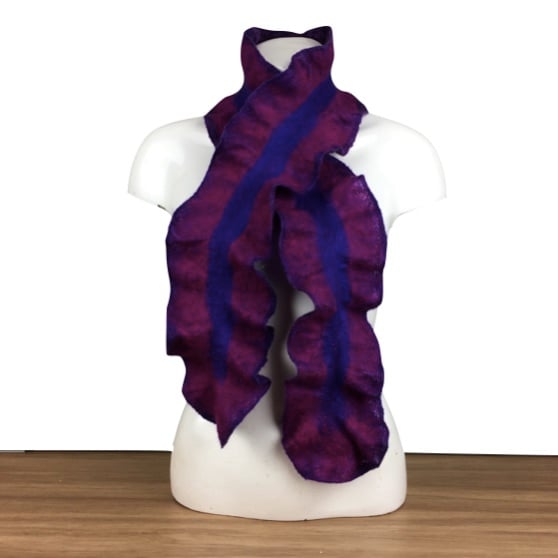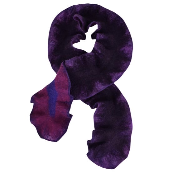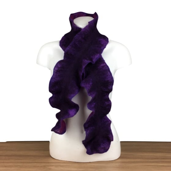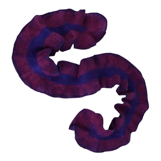 The woollen fibres have been felted and manipulated in such a way as to create a deep ruffle around the border of the scarf to give a structural effect. The layout of the different coloured fibres has created a double sided scarf which is deep purple with light purple highlights on one side and a deep pink and blue on the other effectively giving two scarves in one.