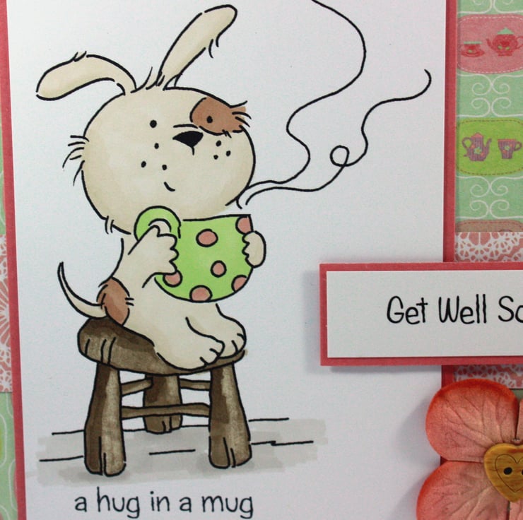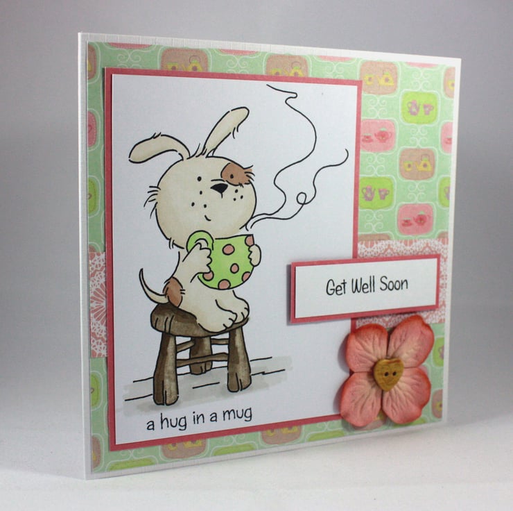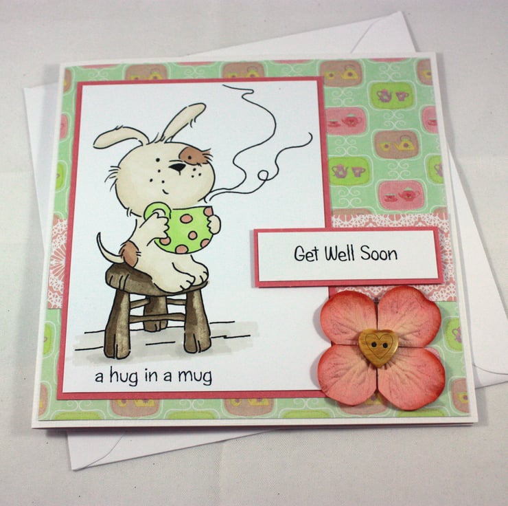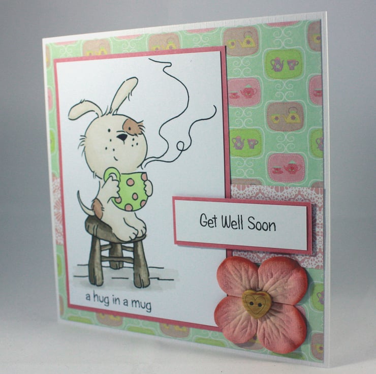 Square, handmade Get Well Soon card, featuring an image of a cute dog sitting having a hot drink. The image is layered over pink card and patterned background paper showing teapots and cups. The message 'Get Well Soon' is raised up slightly and the card is finished with a peach flower embellishment with a heart shaped button in the centre.