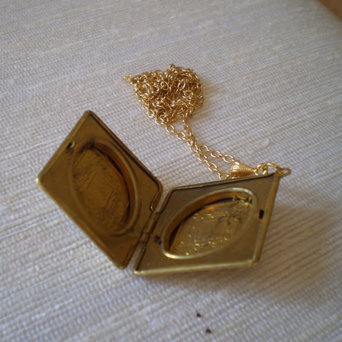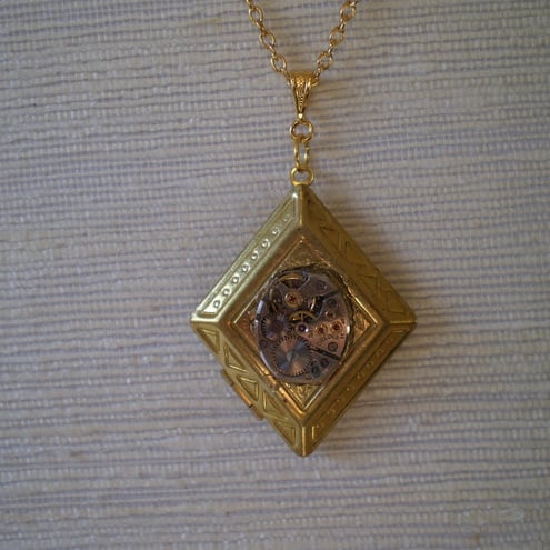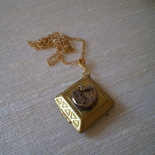 A delightful gold tone Vintage style locket has had a gleaming watch movement added, showing all the intricate working movement. Opens up so that you can add a photo, lock of hair or anything precious to you. Measures a demure 4cms and hangs from an 18 inch chain. An ideal gift for someone special.